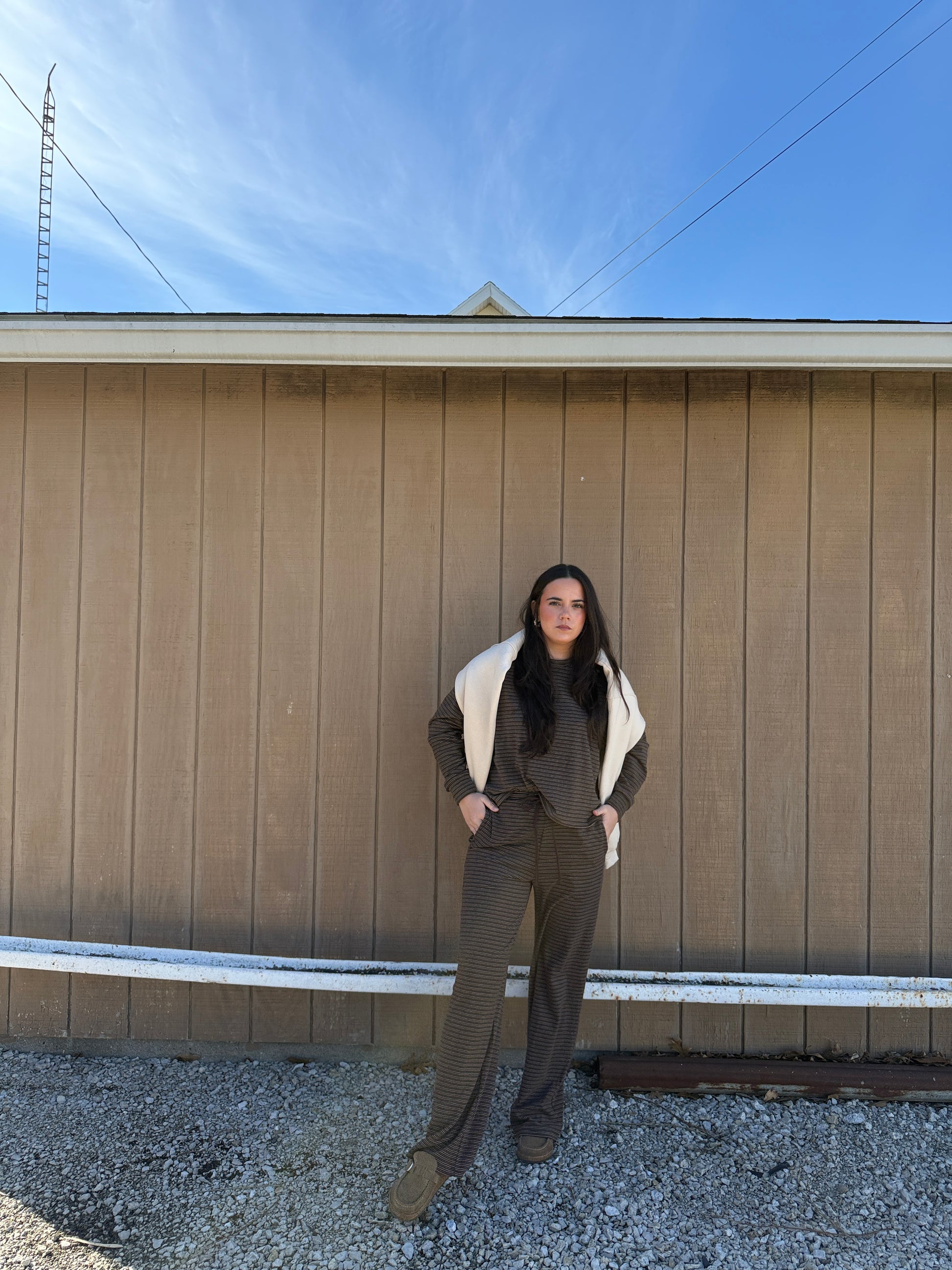 The Allie Striped Lounge Pant features a drawstring waist for adjustable comfort, a long length for optimal coverage, and a soft, stretchy fabric that enhances flexibility. This design promotes ease of movement, making it suitable for both relaxation and light activities. Ideal for everyday wear, it combines practicality with comfort.