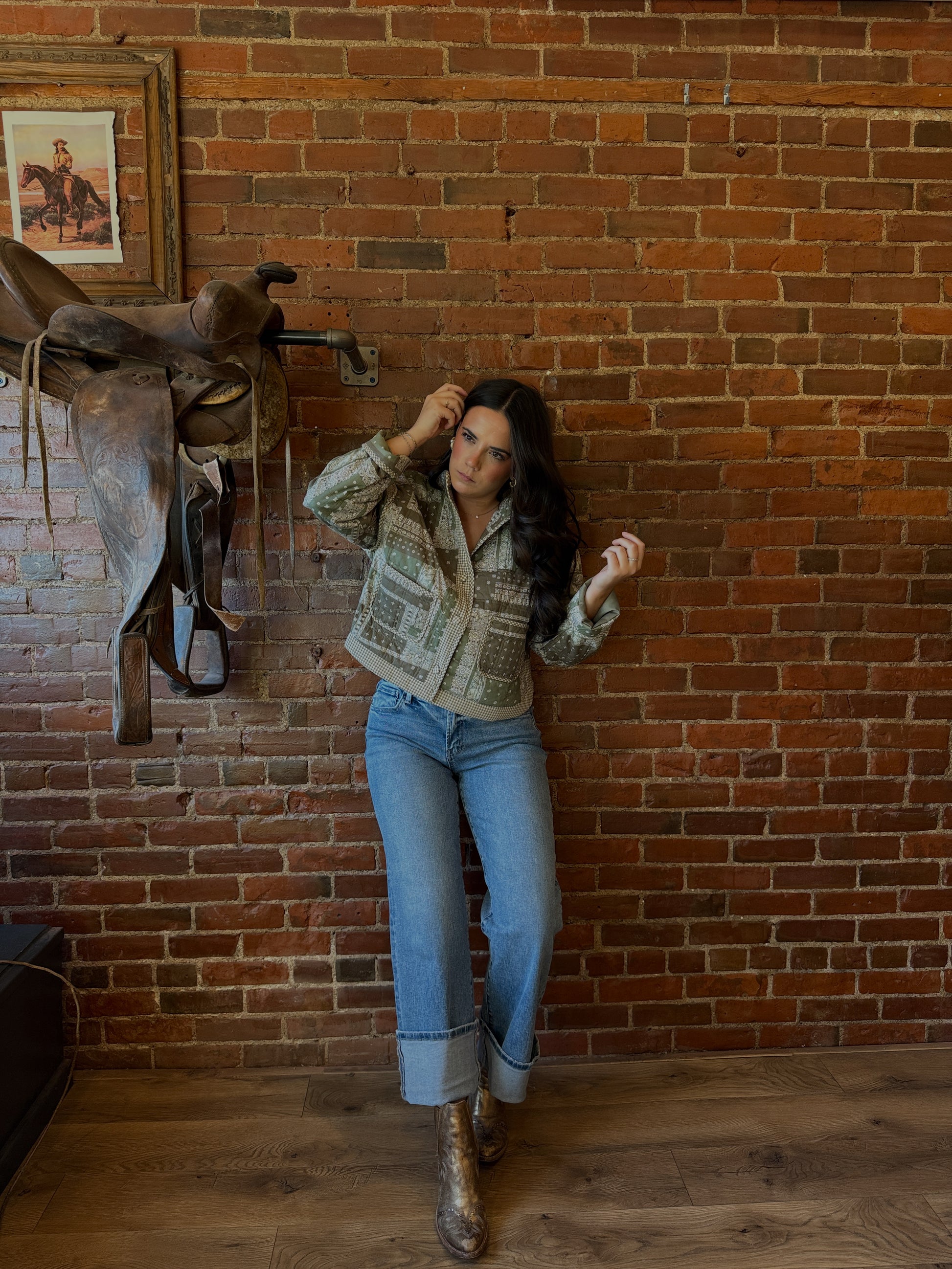 The Bandana Quilted Jacket features a unique and stylish olive green color with a striking bandanna print. With a button-up design and convenient front pockets, this jacket showcases both fashion and functionality. Stay warm and on-trend with this must-have addition to your wardrobe.