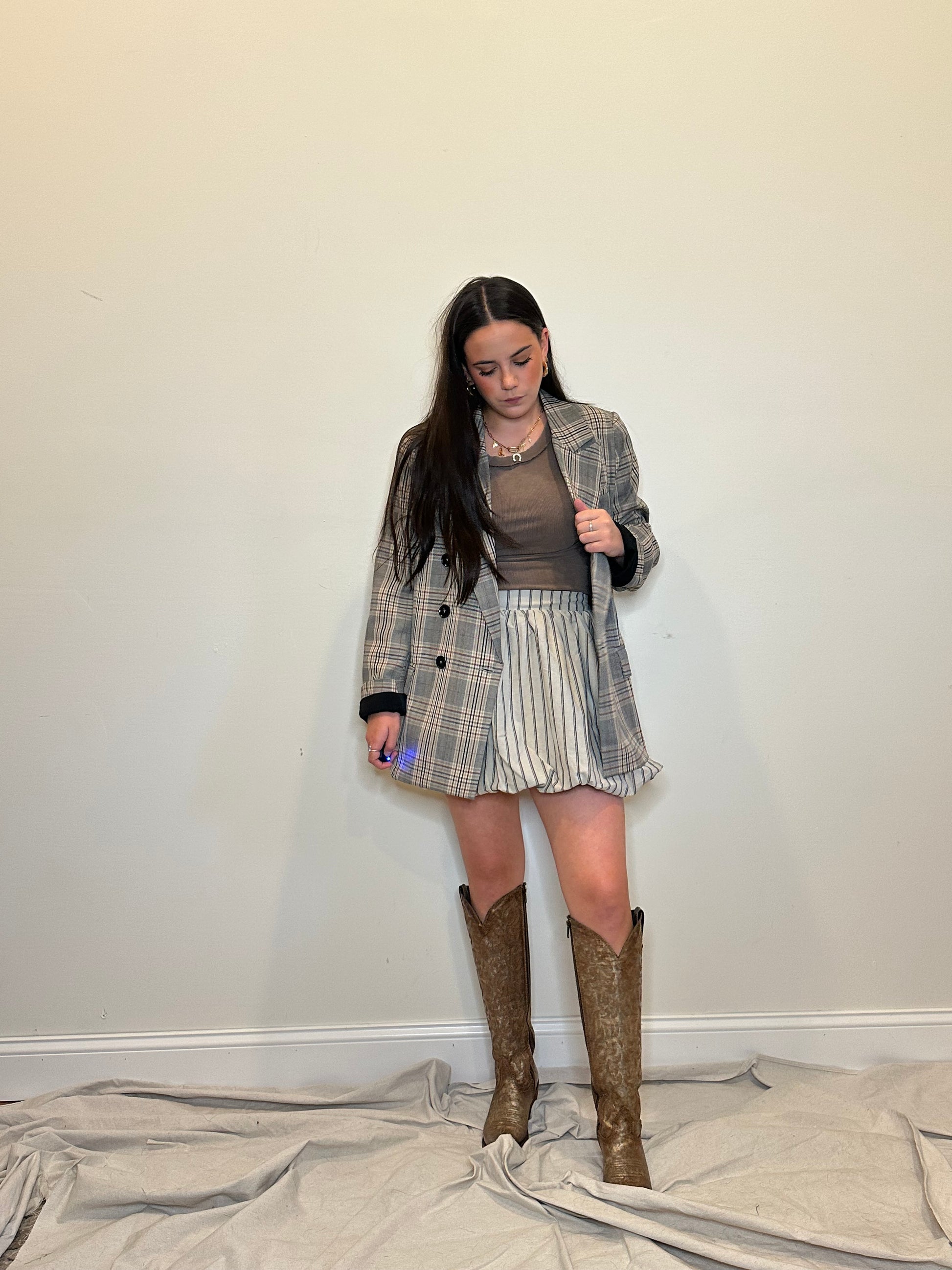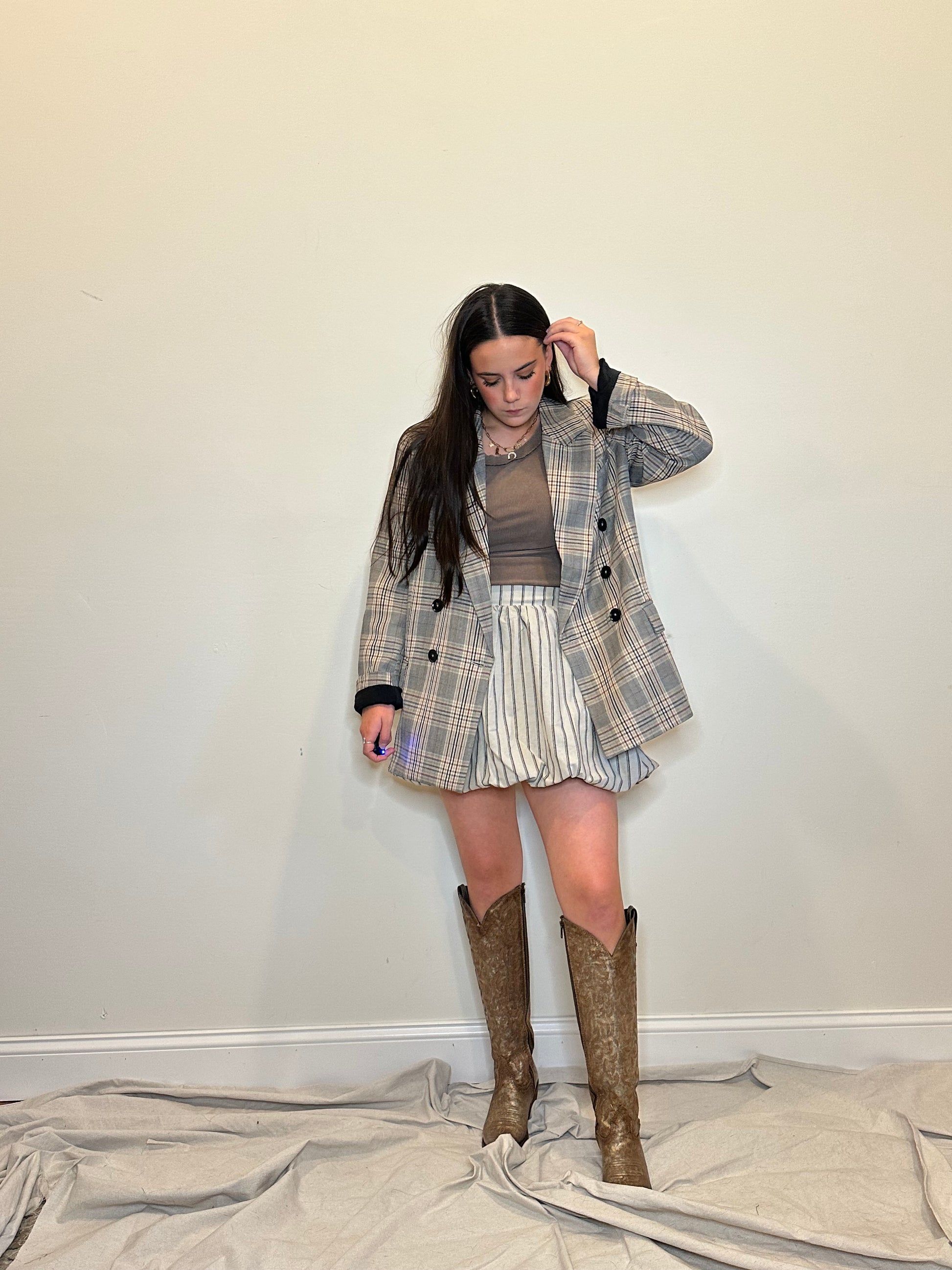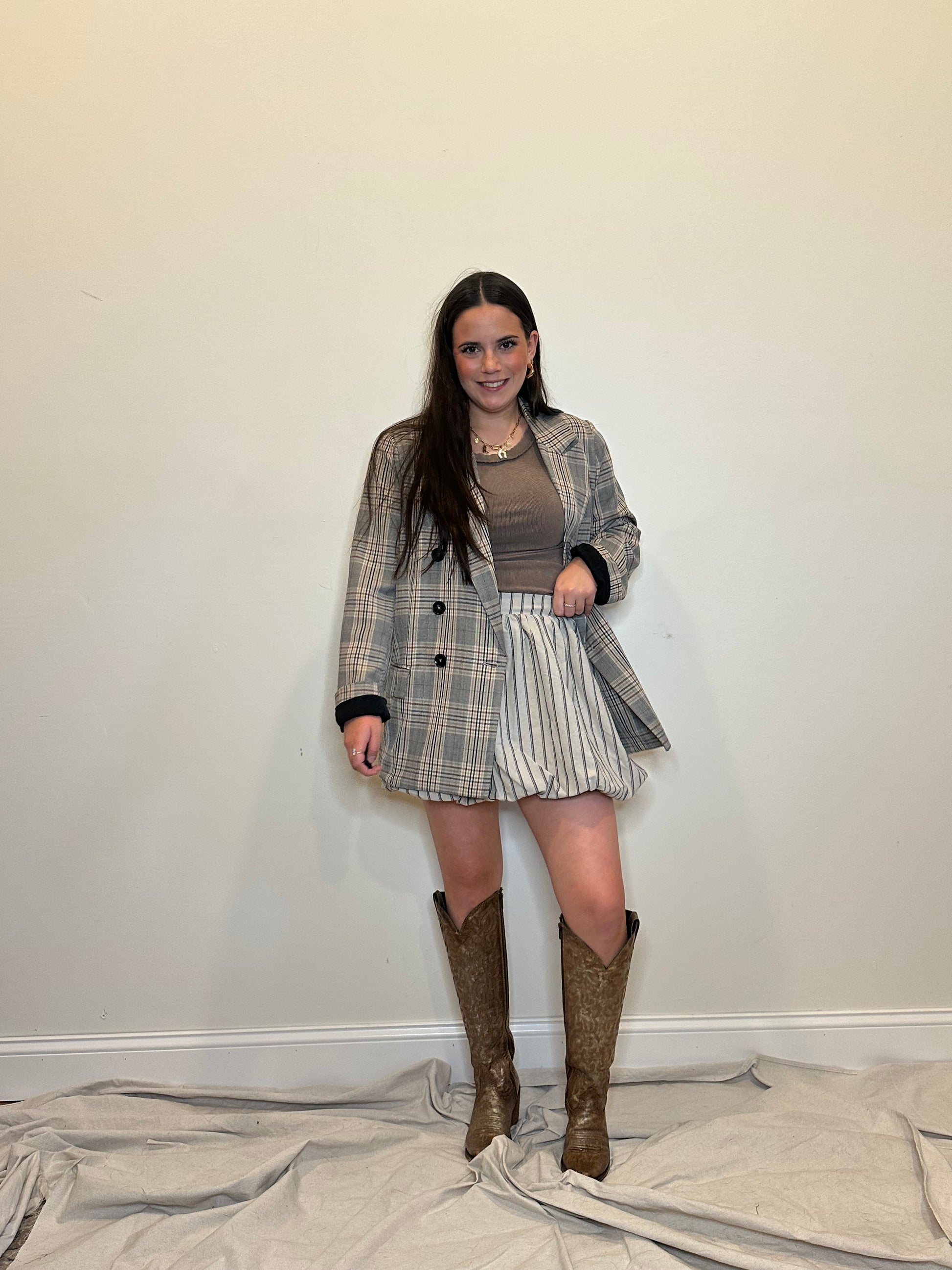 Crafted with a flattering bubble silhouette, the Baylor Bubble Skirt is a must-have addition to your wardrobe. The easily adjustable elastic waistband ensures a comfortable fit for all-day wear. Made with a chic stripe pattern, this skirt effortlessly adds a touch of style to any outfit.
