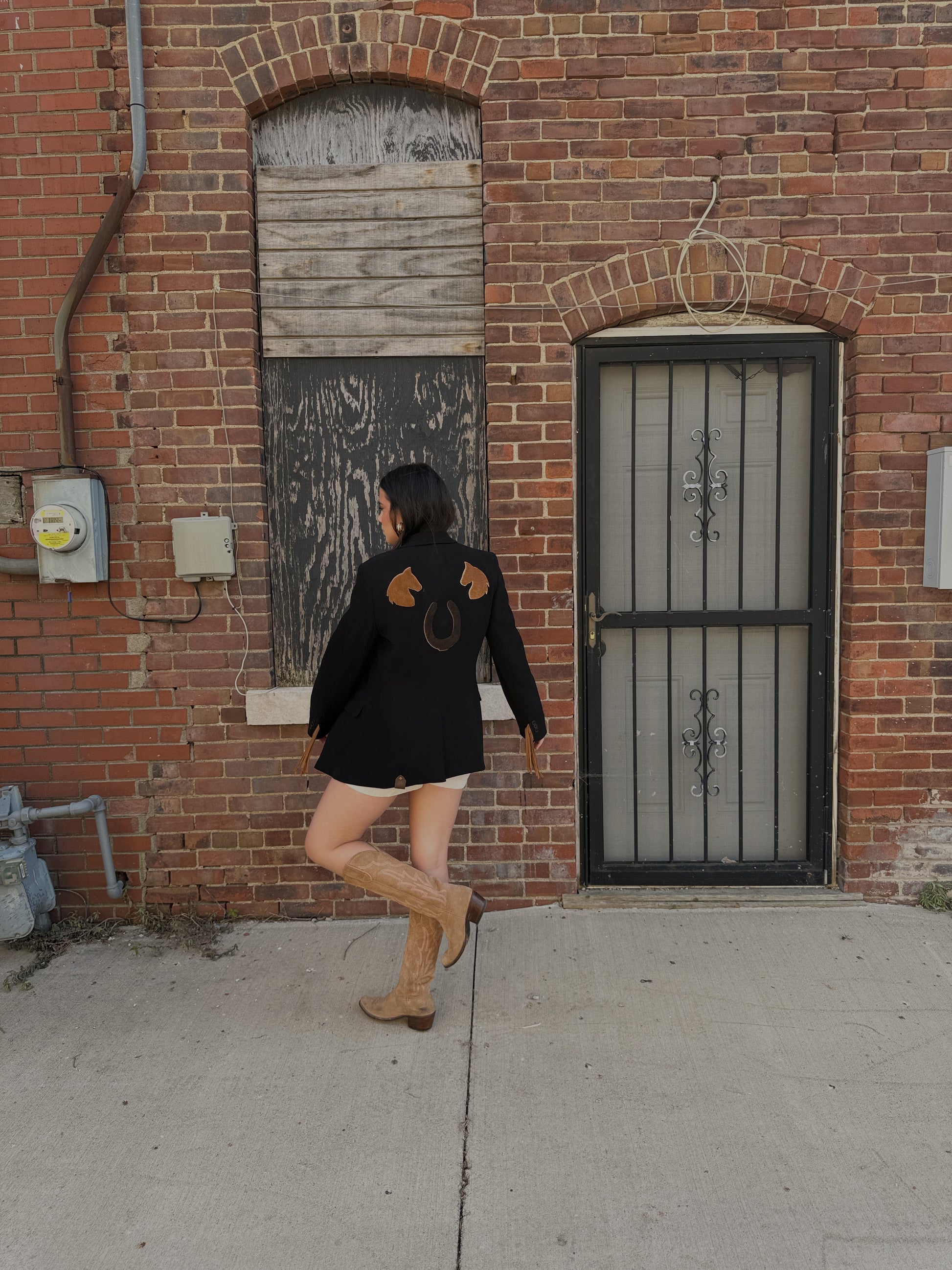 Introduce a touch of vintage to your wardrobe with our Canyon Fringe Blazer. Expertly crafted with hand sewn leather patches and fringe cuff detail, this blazer exudes sophistication and charm. Its flexible fit, between a small and medium, ensures a flattering silhouette for any occasion. Elevate your style with this timeless, one of a kind piece.