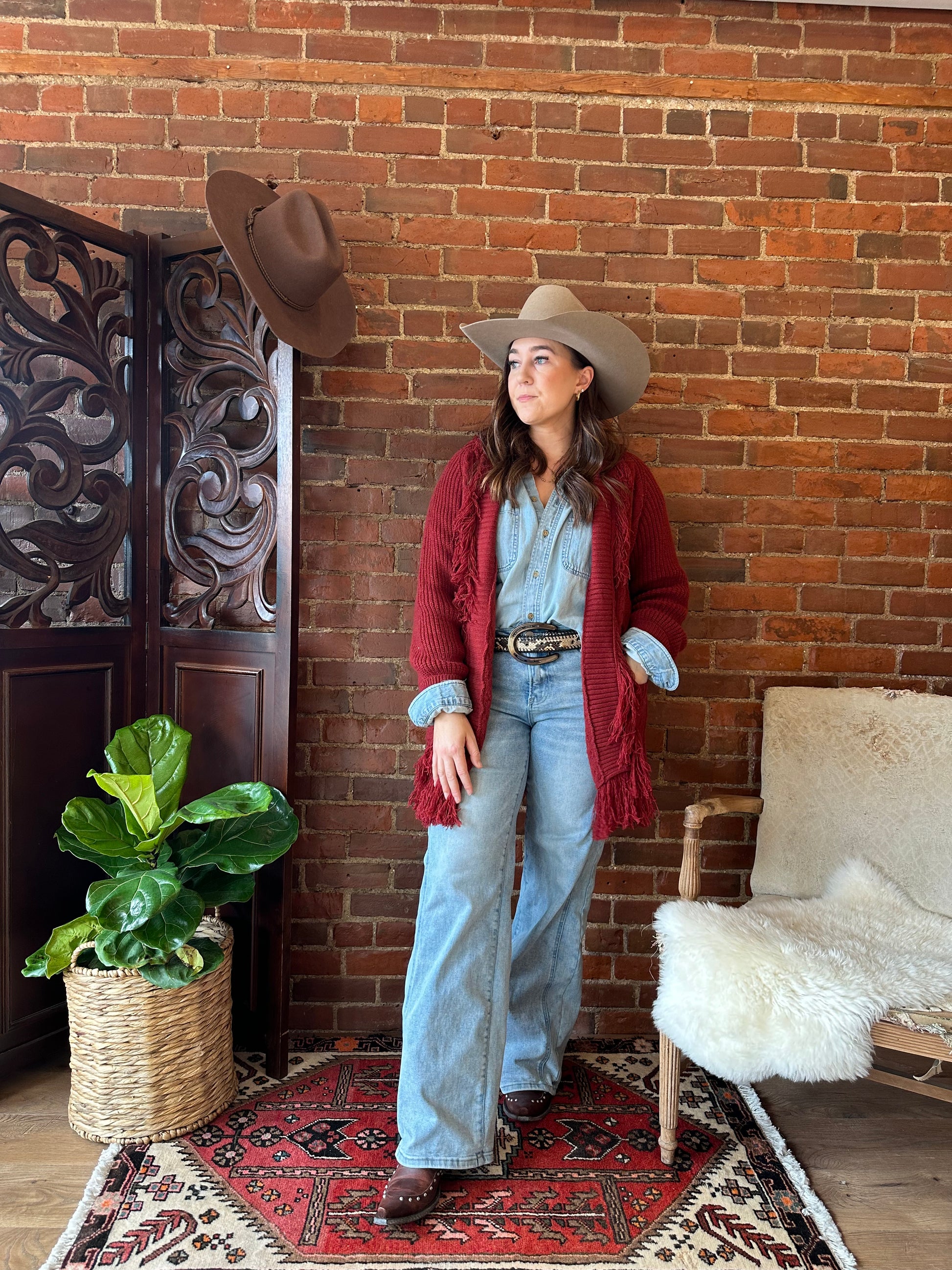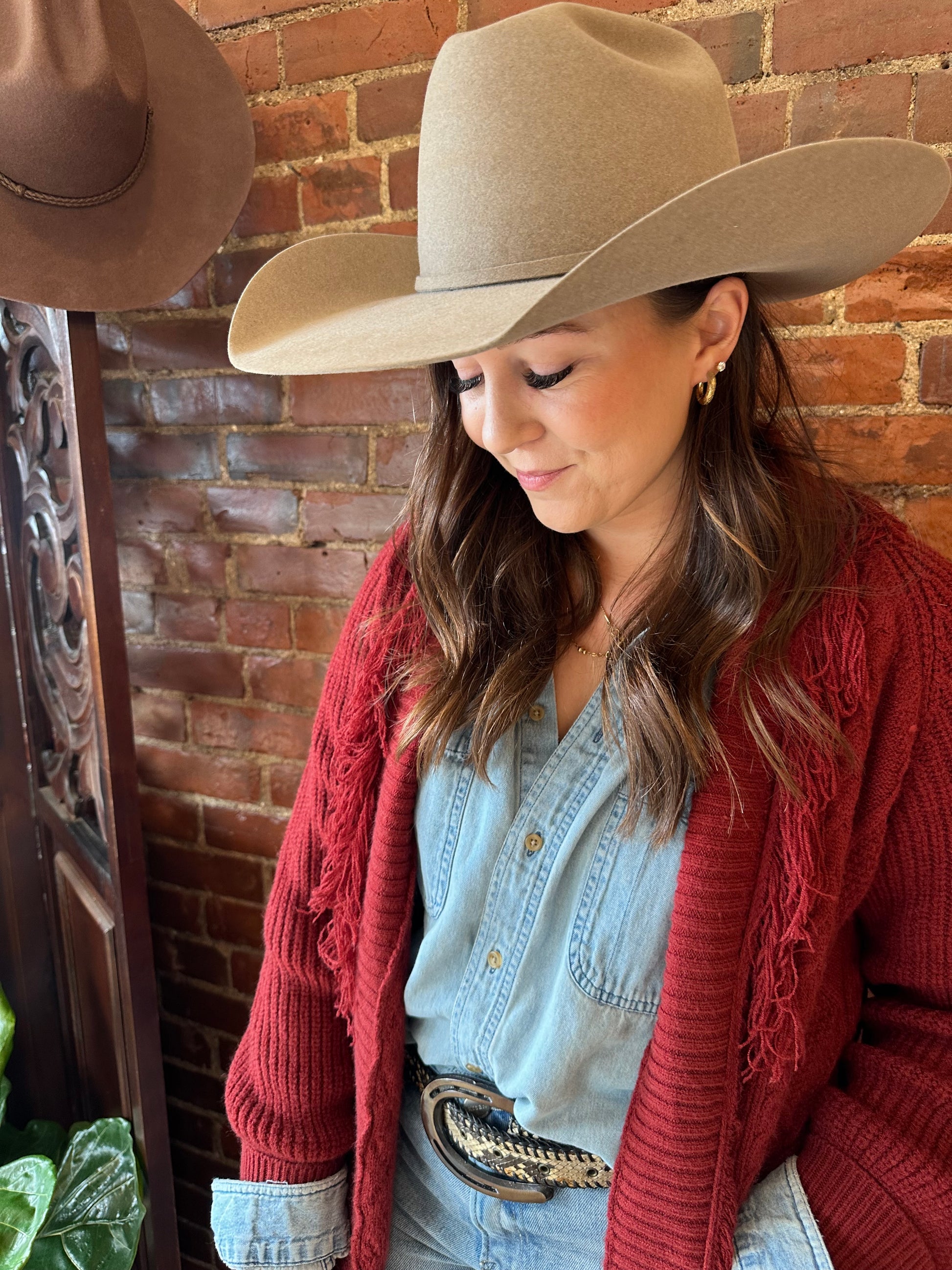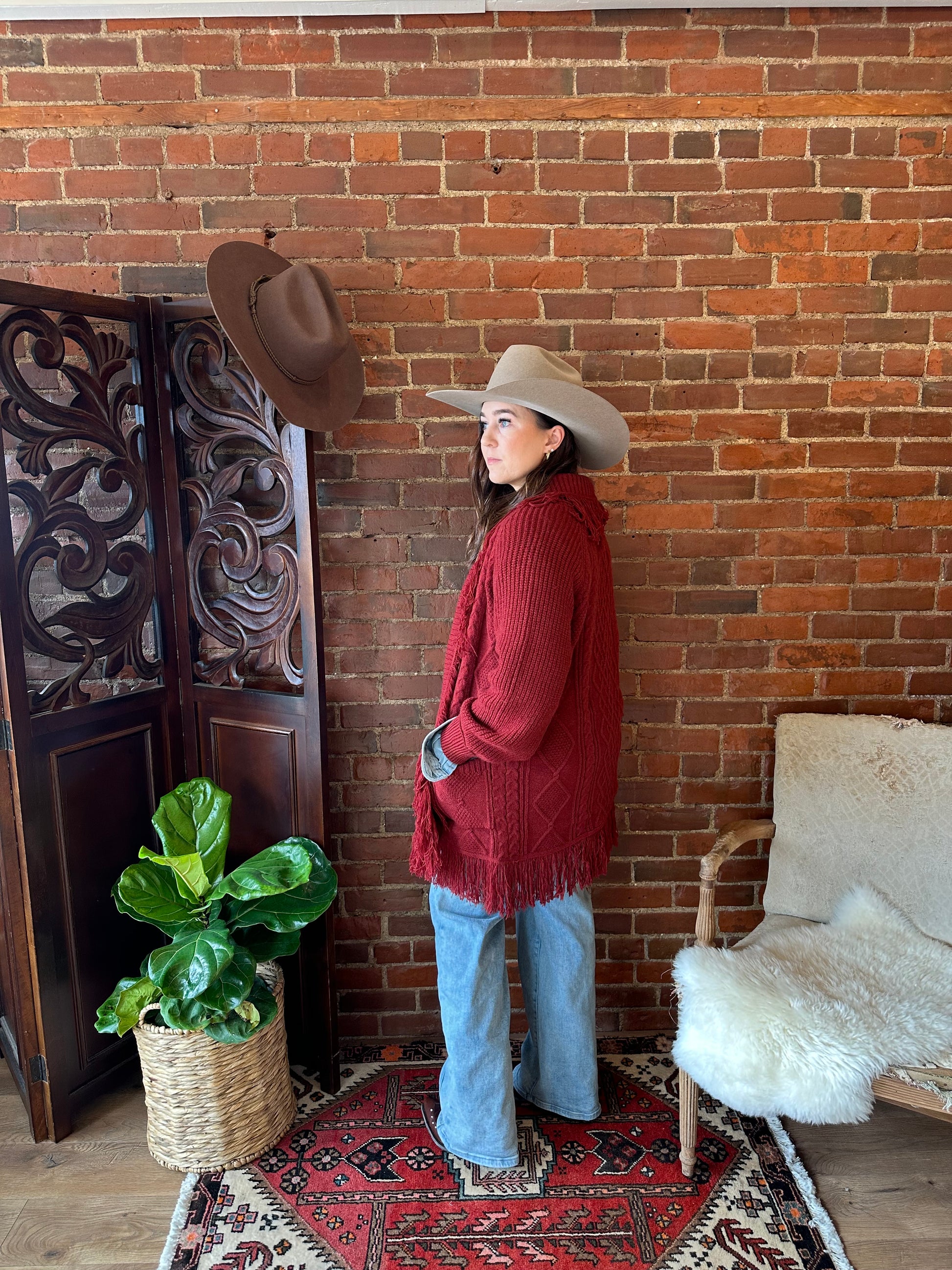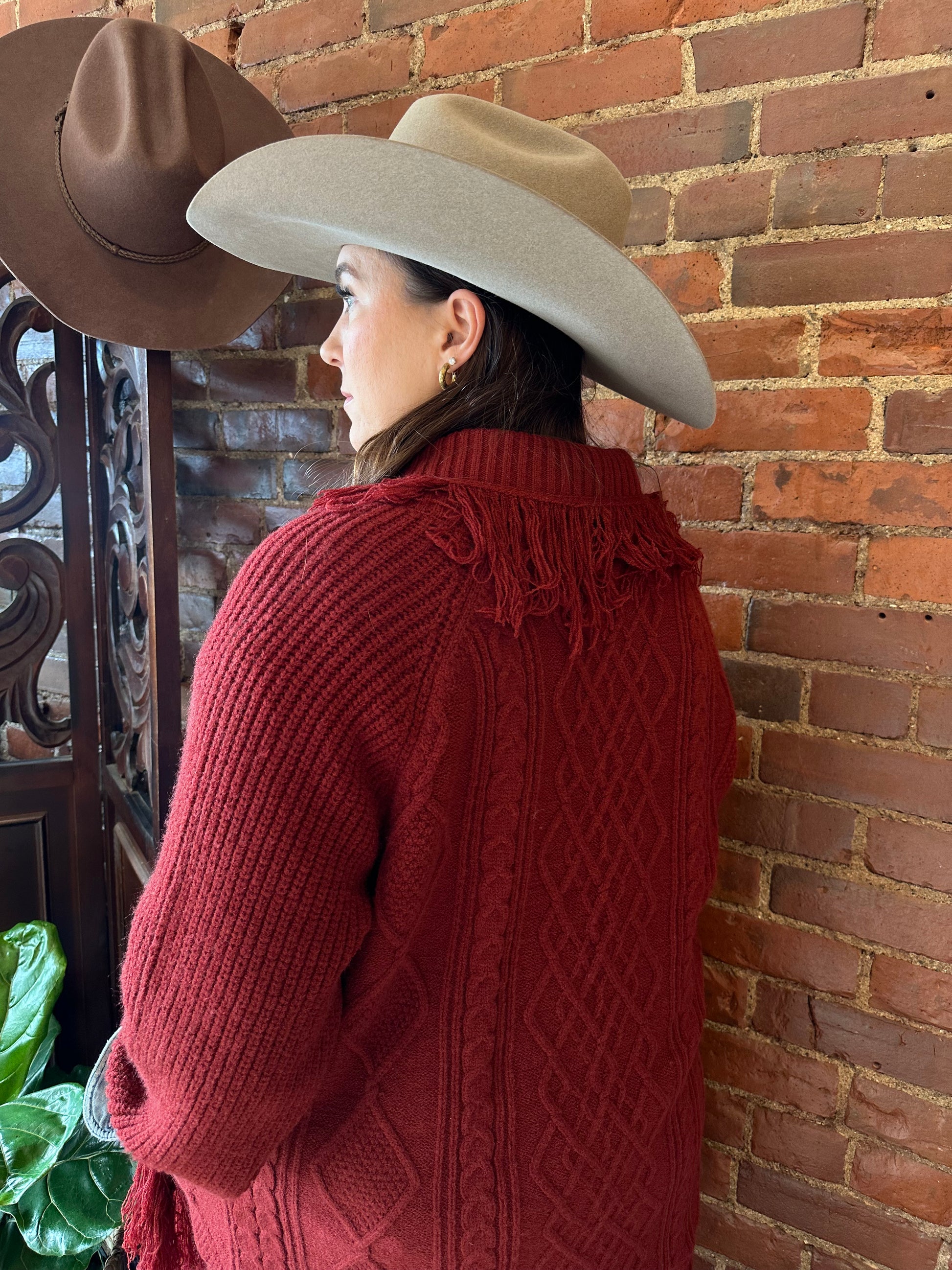 Stay cozy and stylish in our Cara Fringe Cable Knit Cardigan. This cable knit cardigan features fringe detailing and a belted design, adding a fashionable touch to your winter wardrobe. Keep warm and make a statement with this must-have piece.