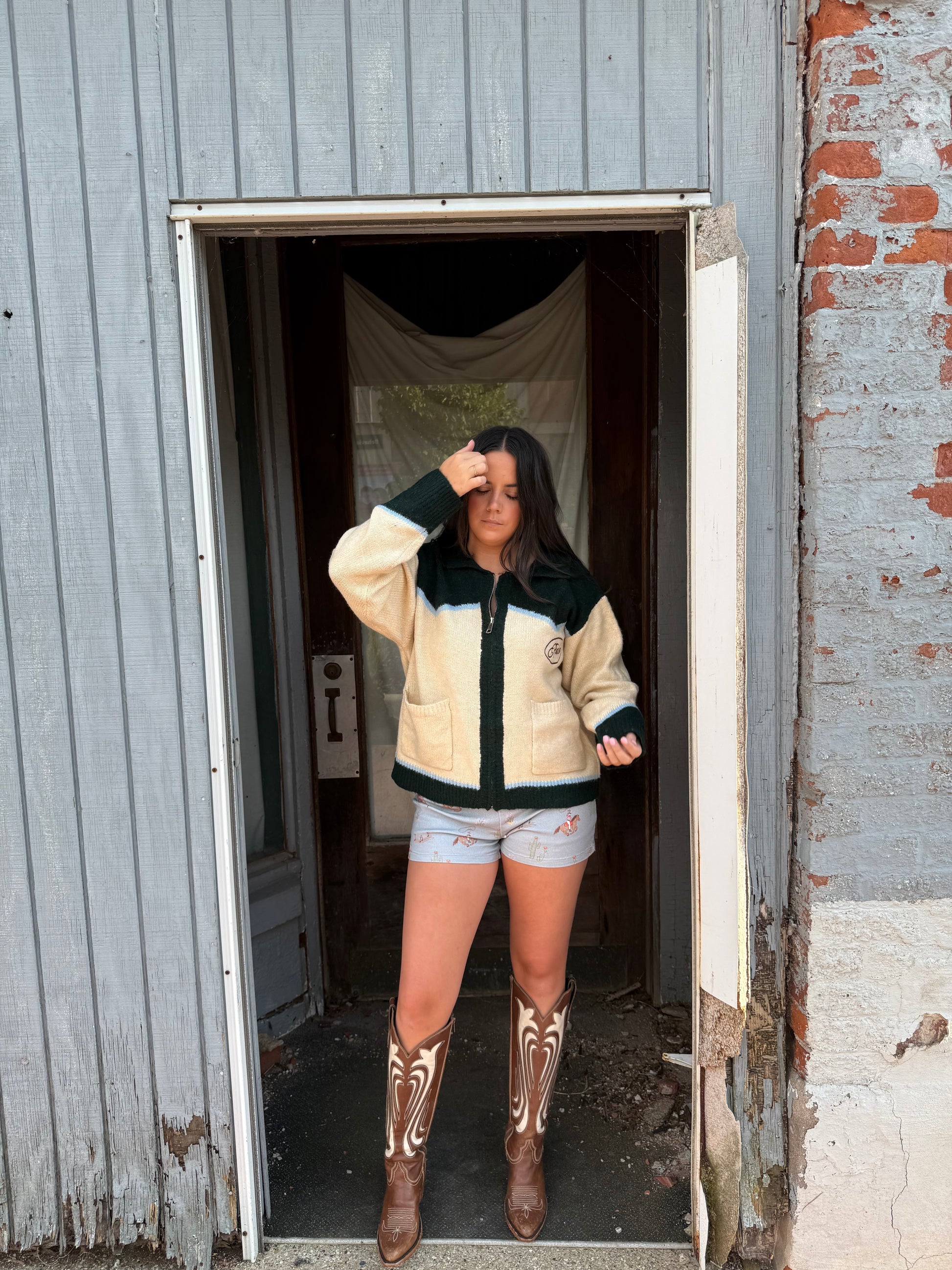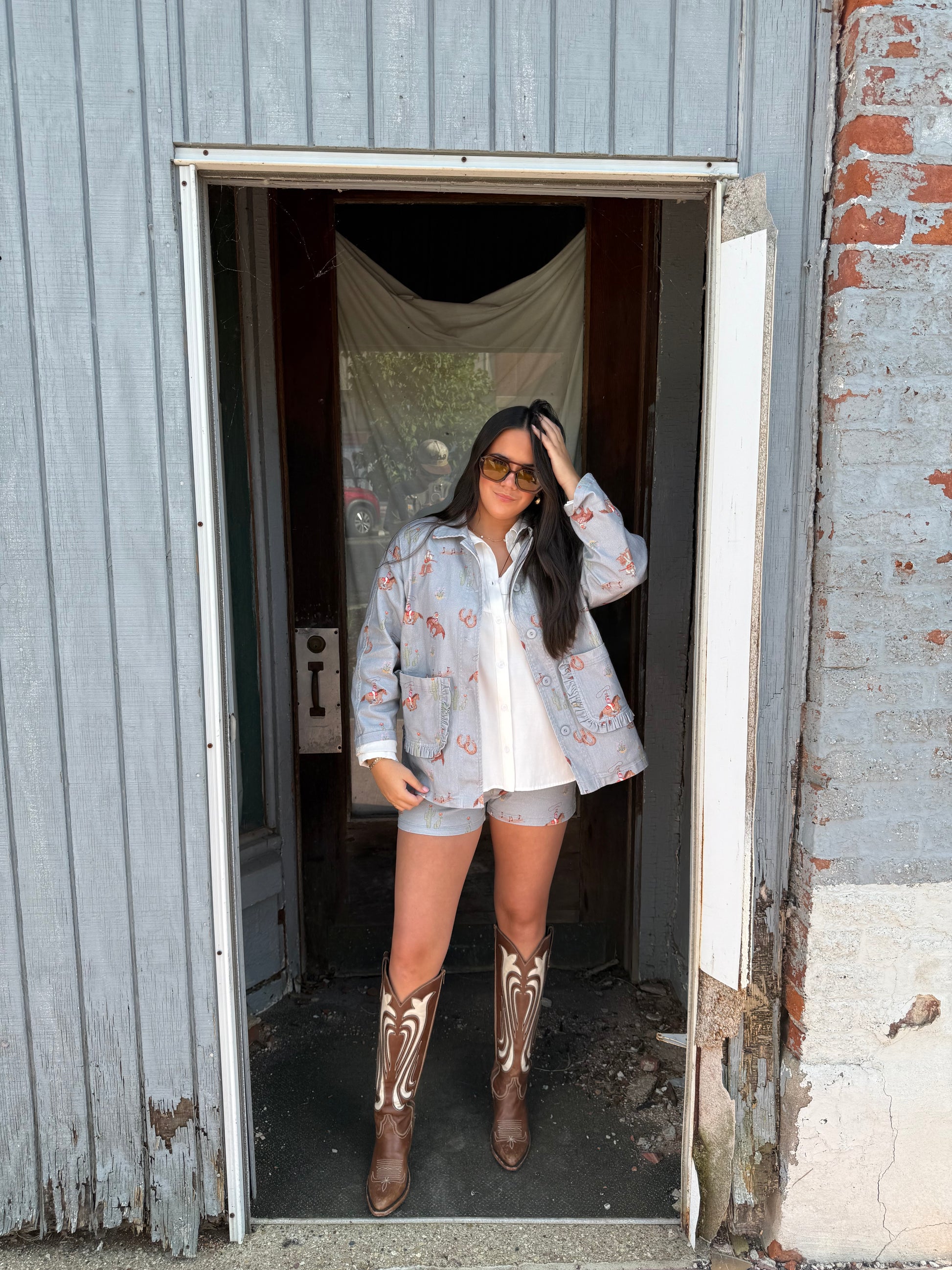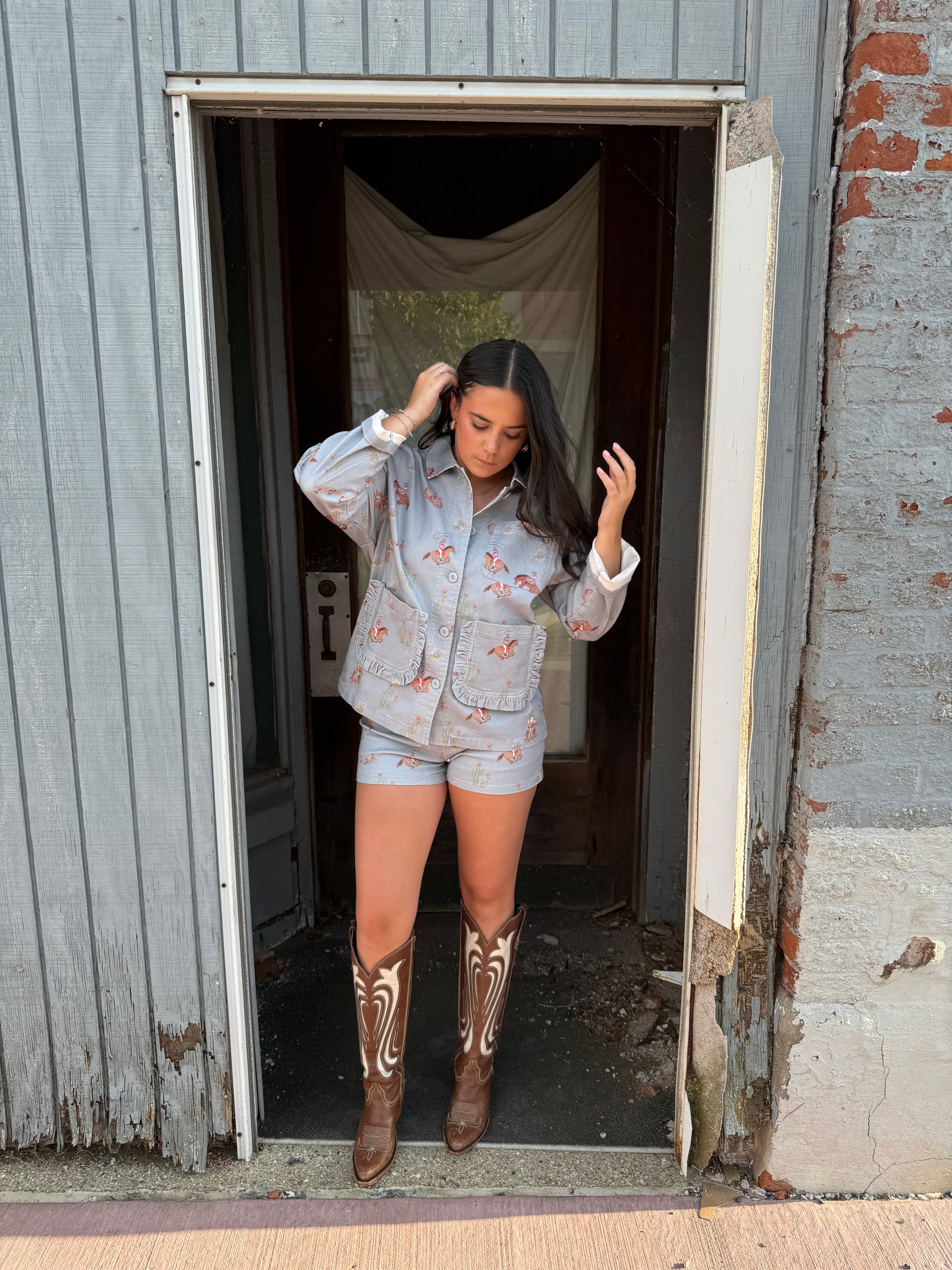 Expertly tailored for cowgirls, our Cowgirl Blues Shorts feature iconic cowgirl motifs and a sleek back zipper. Size up for added comfort and style.
