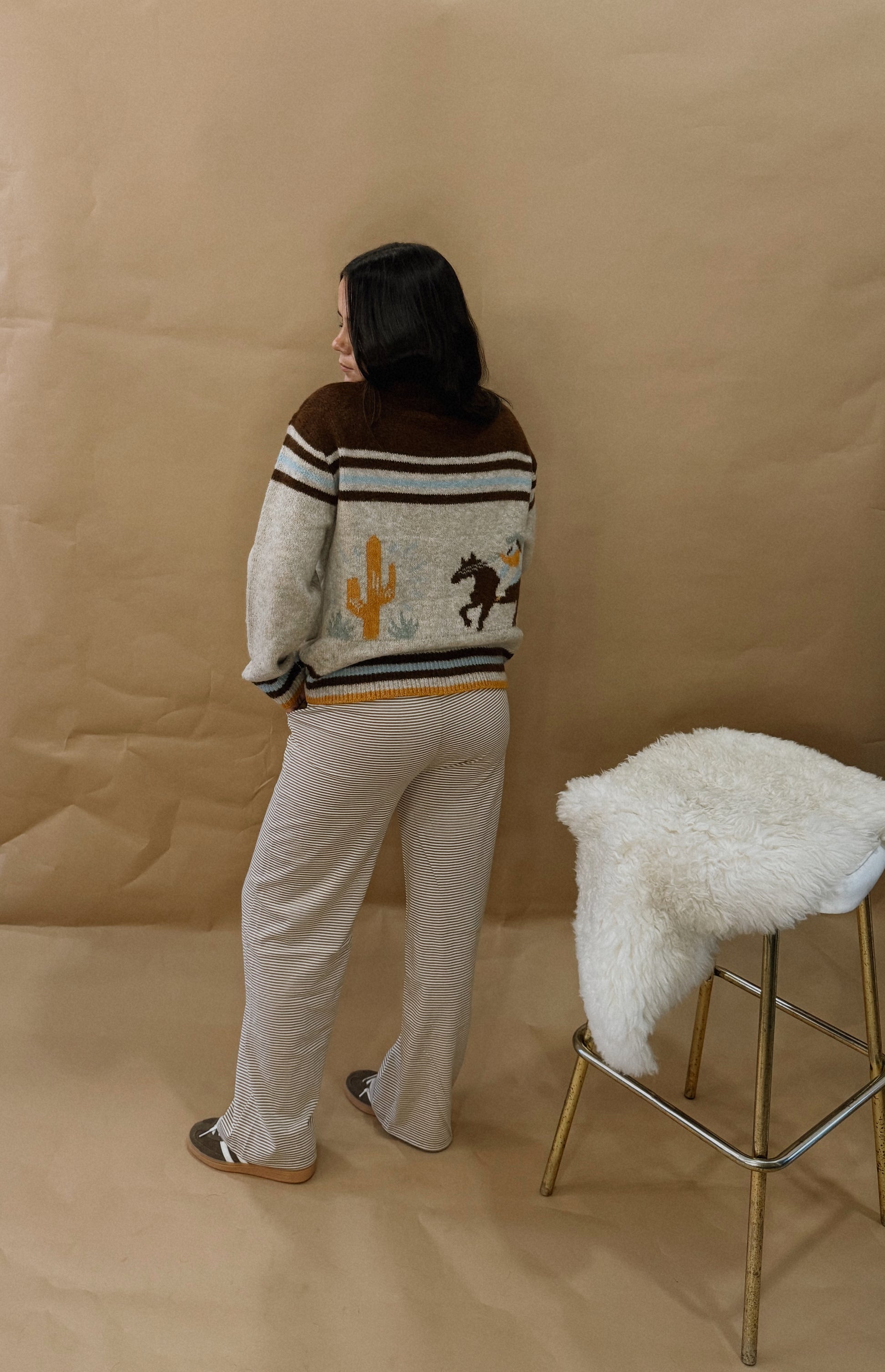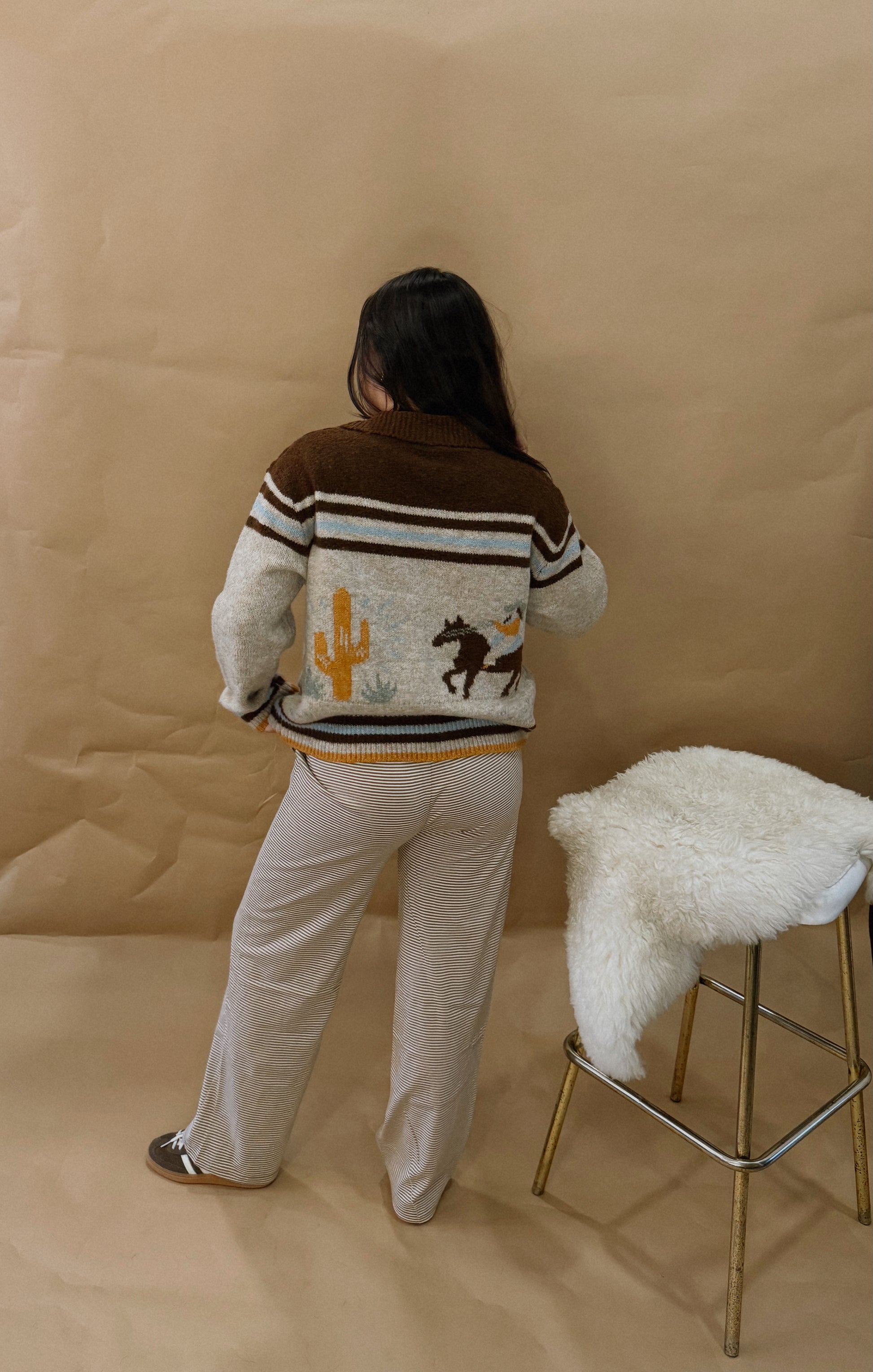 The Desert Dreams Cardigan is a versatile and stylish addition to your wardrobe. This zip-up cardigan features front pockets for added convenience, while the cowgirl and cactus graphic on the back adds a unique touch. This cardigan is a must-have for those looking for comfort and style.