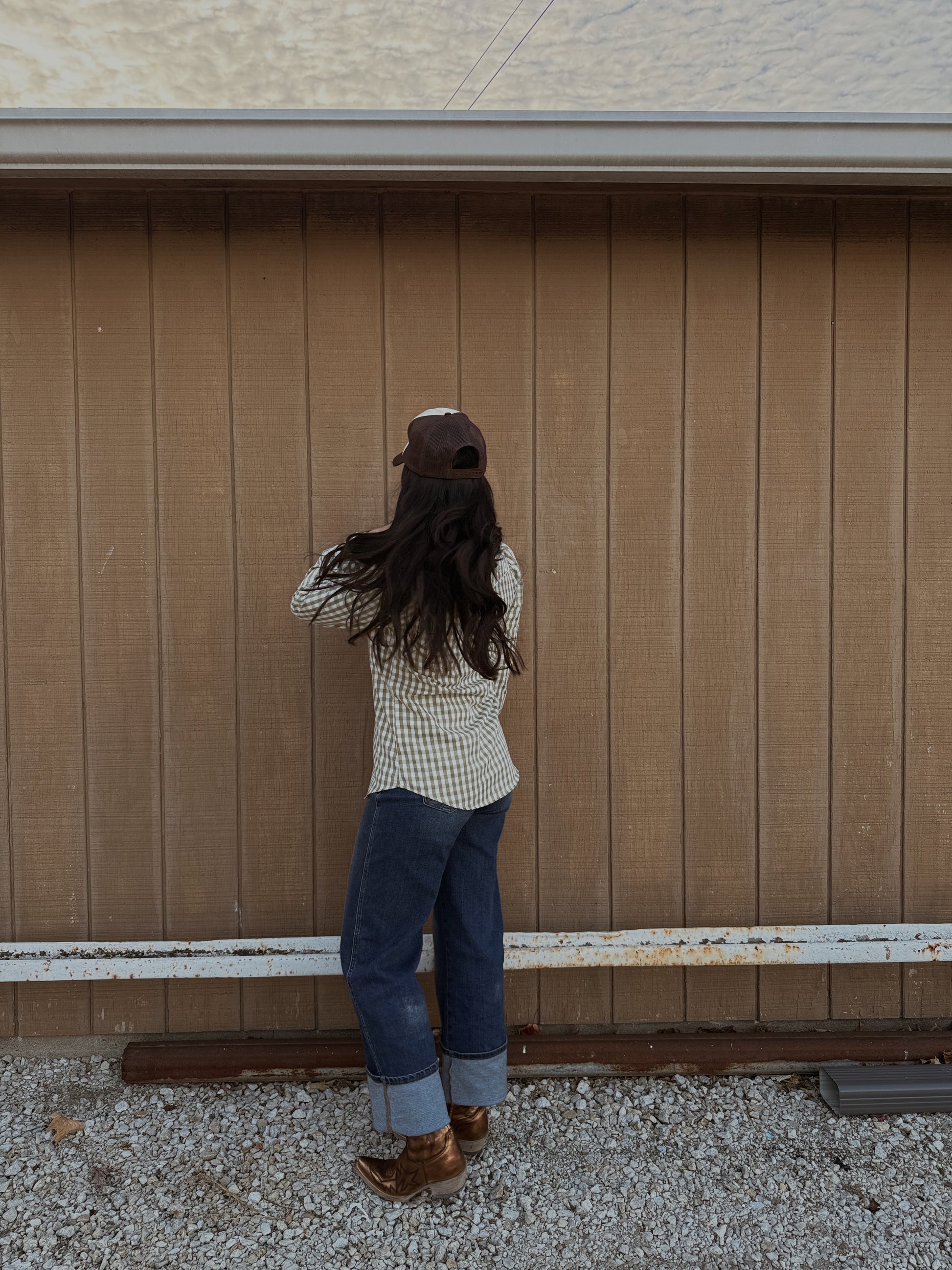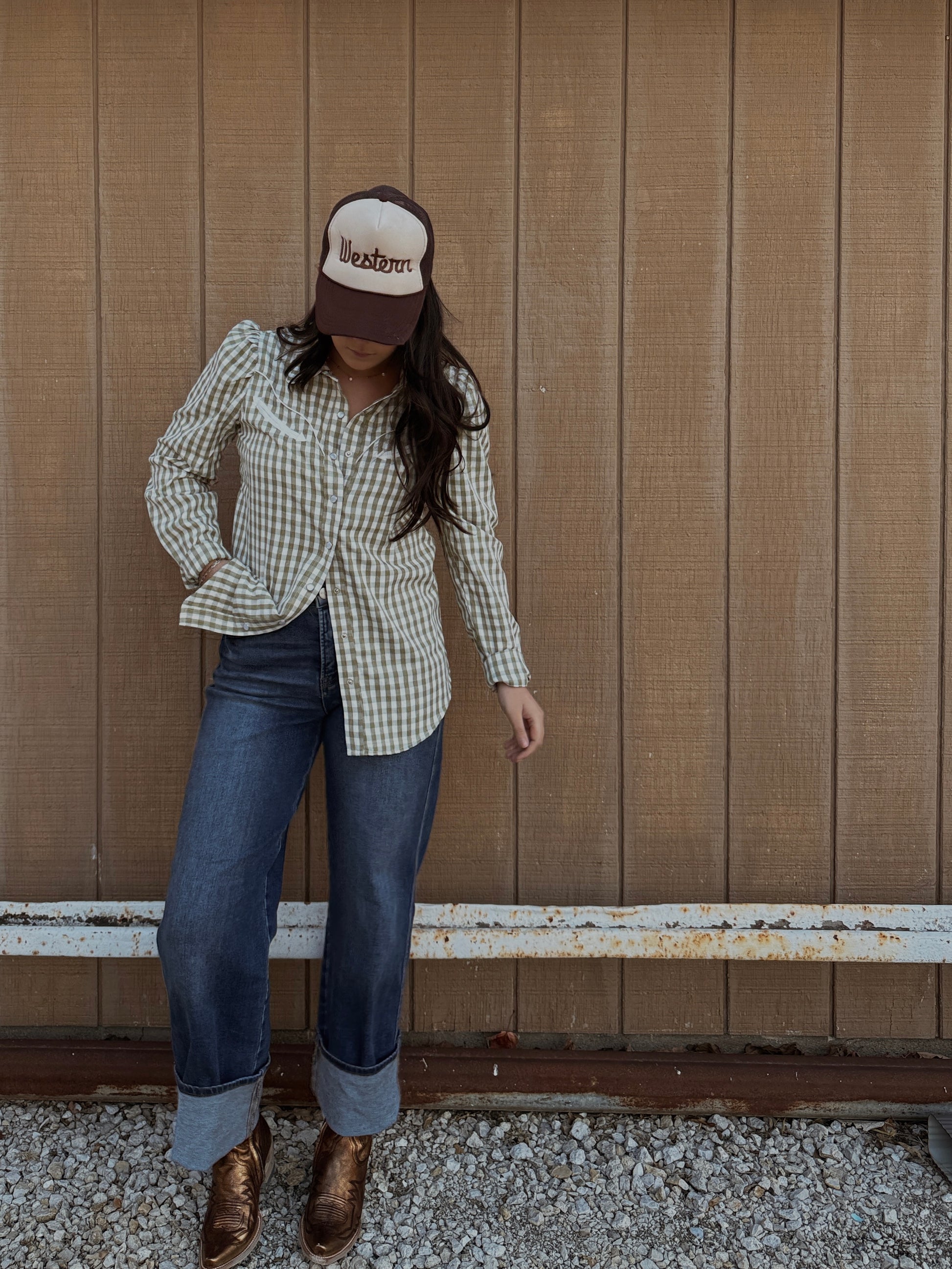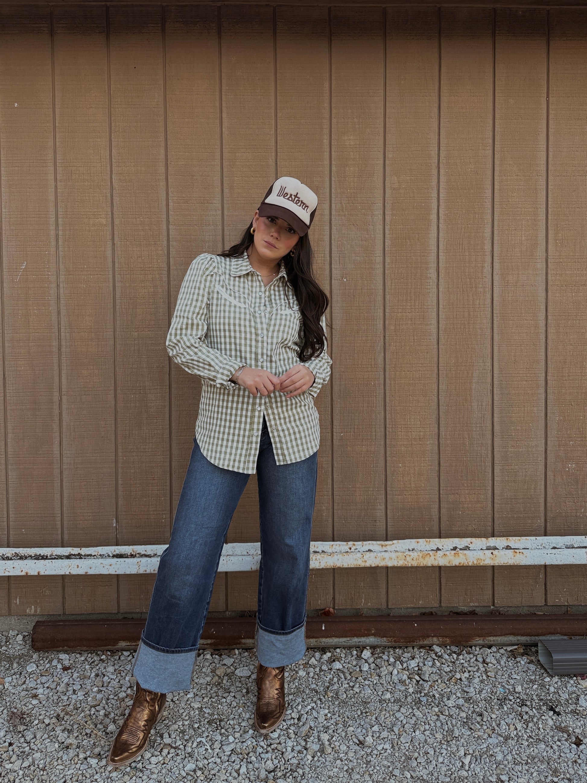 The Evergreen Pearl Snap adds a touch of vintage charm with its pearl snap buttons, gingham pattern, retro piping, and mini puff sleeves. It's the perfect combination of modern and classic style, making it a versatile and trendy addition to any wardrobe.