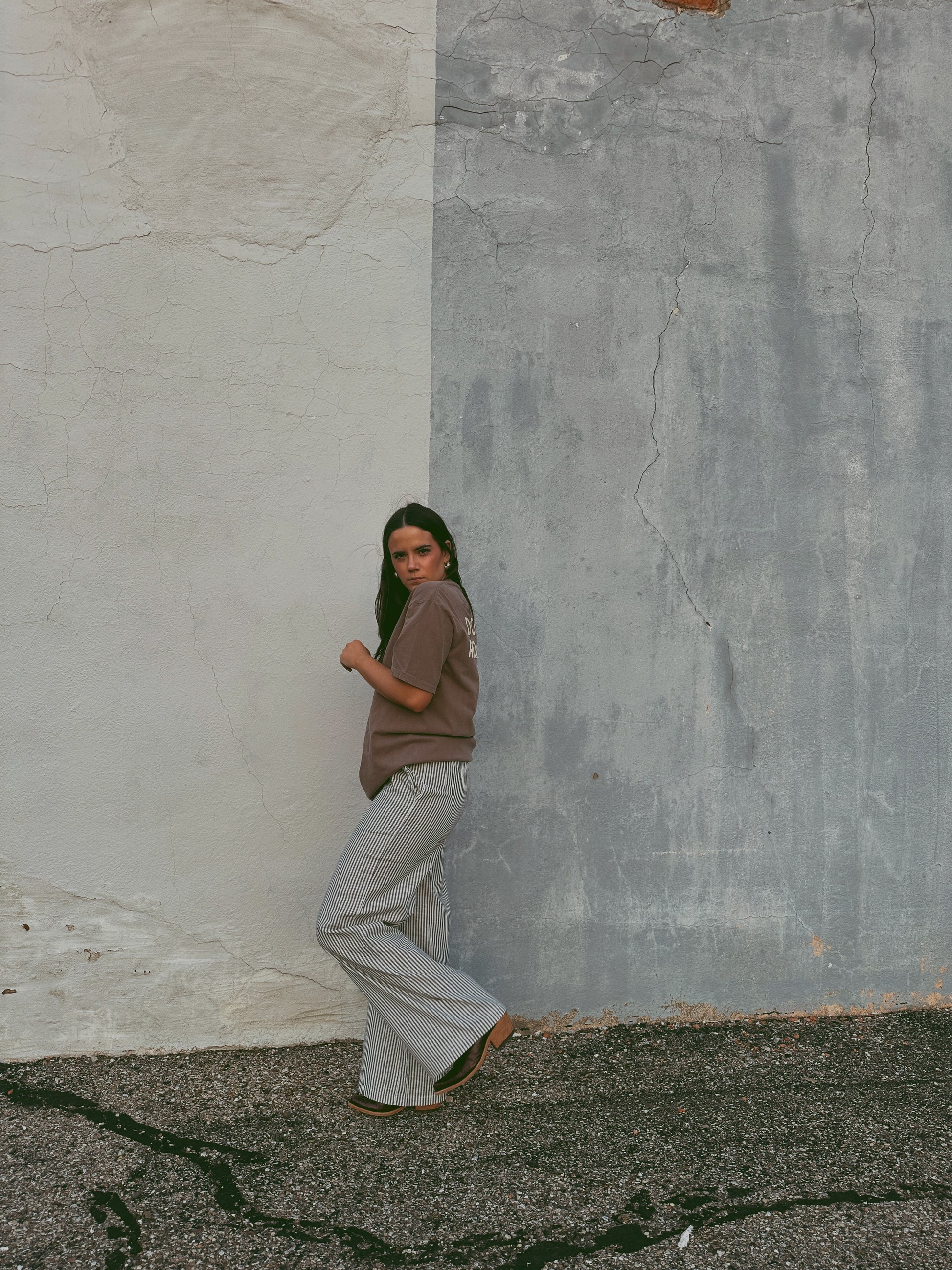 Introducing Gone Walking Pants for the stylish and practical woman. Features include a flattering high waist, convenient elastic waist, and classic striped design. With a comfortable 30" inseam, these pants are perfect for any casual or active occasion.