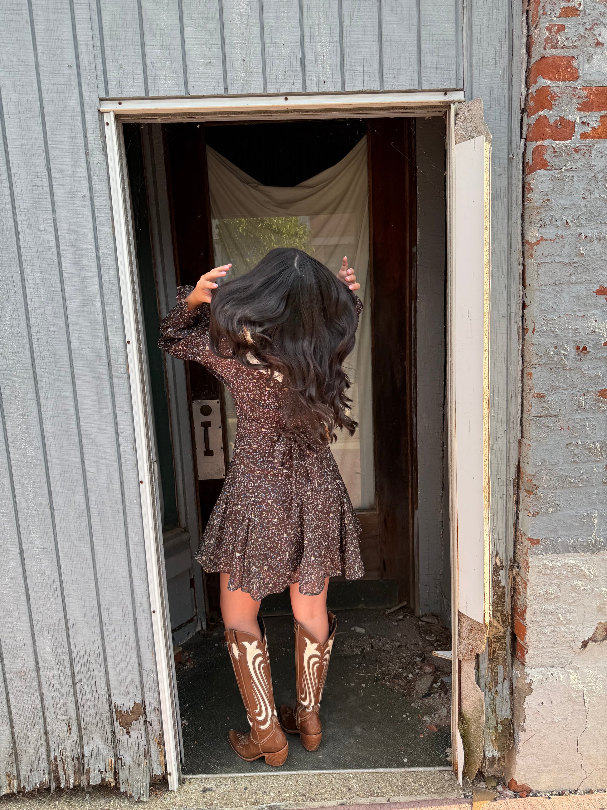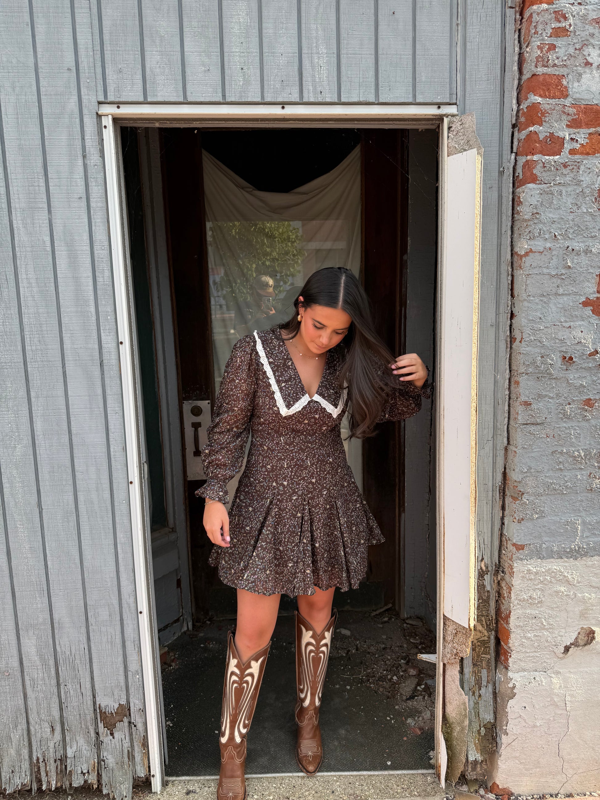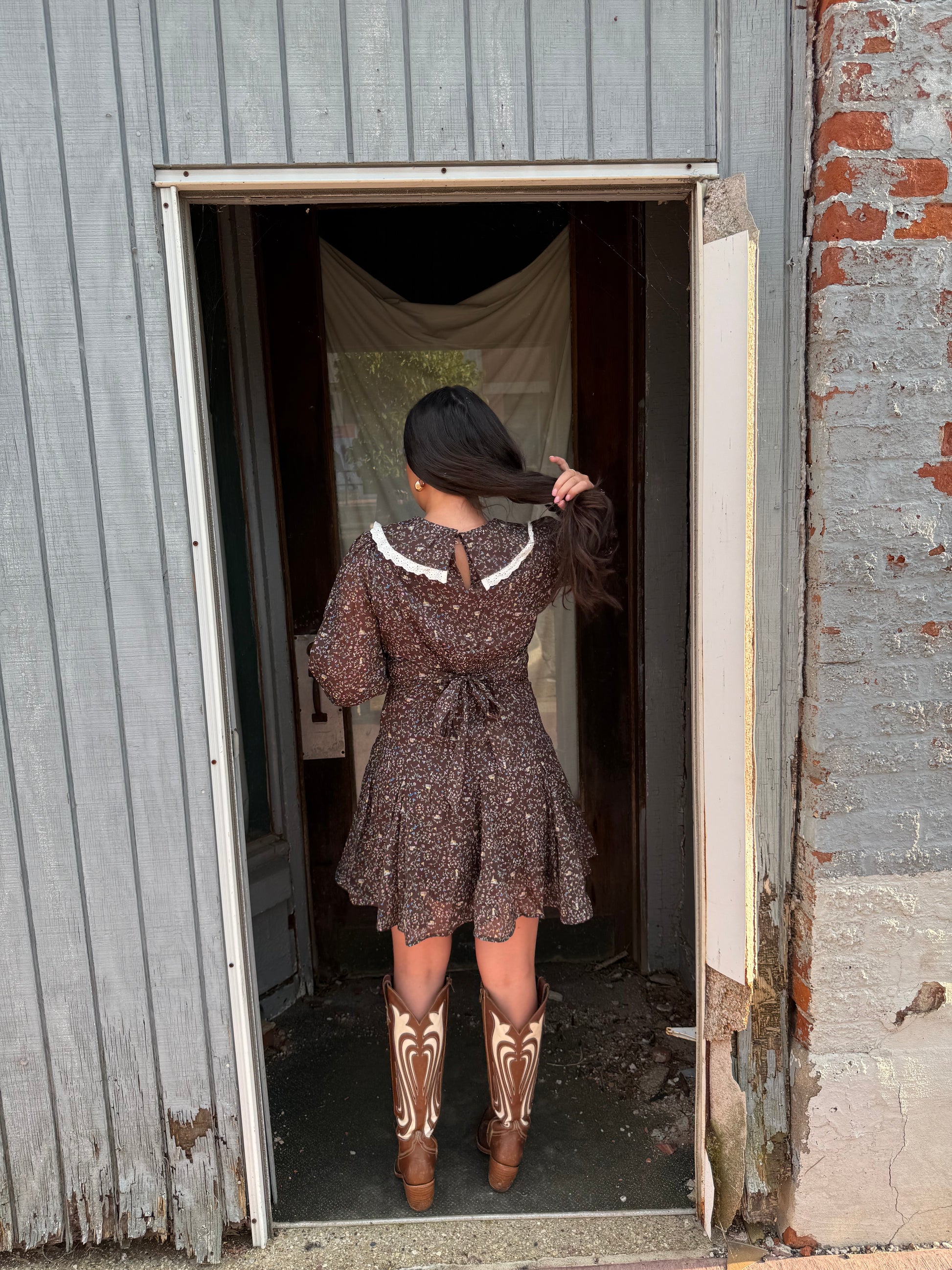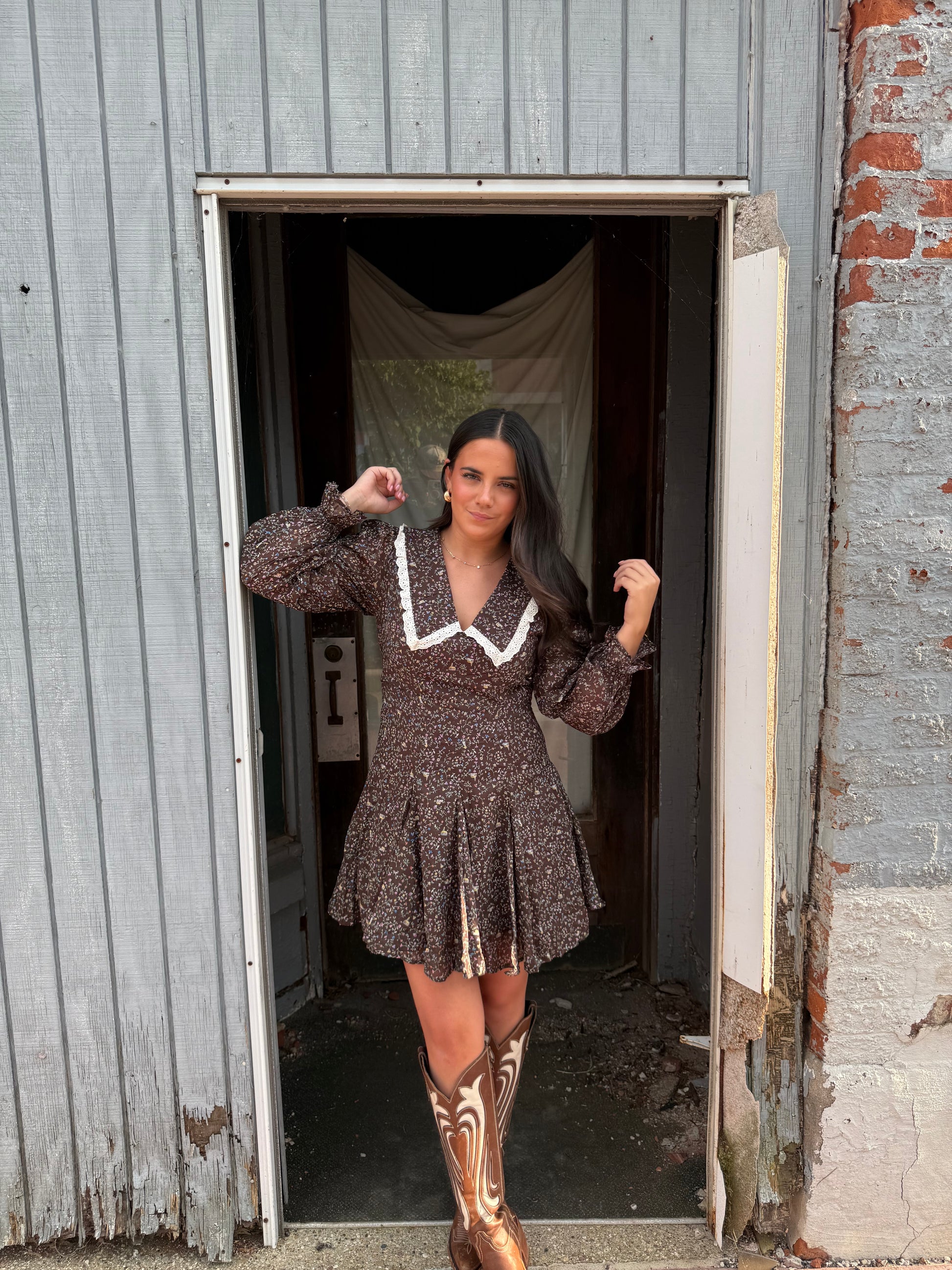 This Hallie Floral Dress showcases a beautiful mix of brown floral print with charming houses and churches, adding a unique touch. The Peter Pan collar adds a classic touch, while the tie back ensures a flattering fit. A side zipper allows for easy wear. Elevate your style with this statement dress.