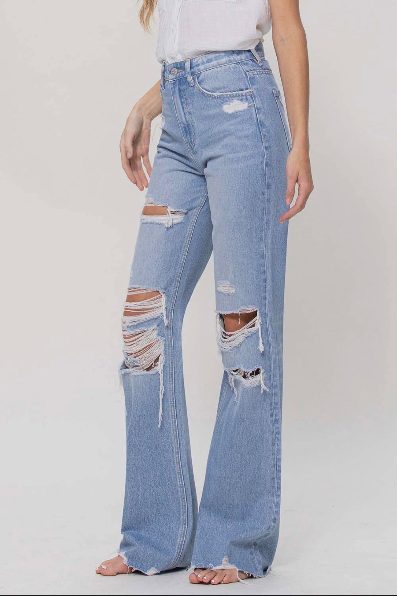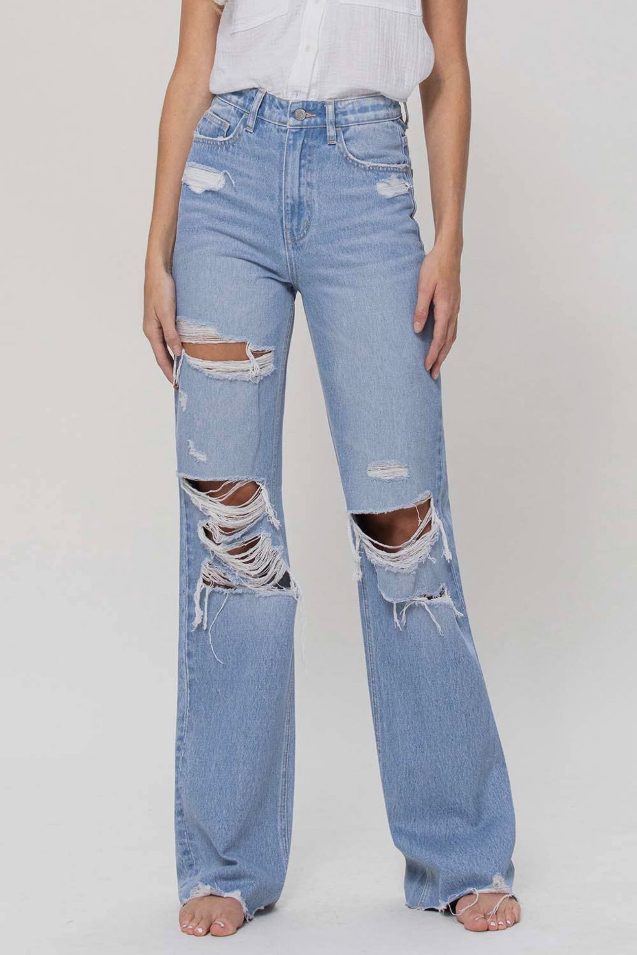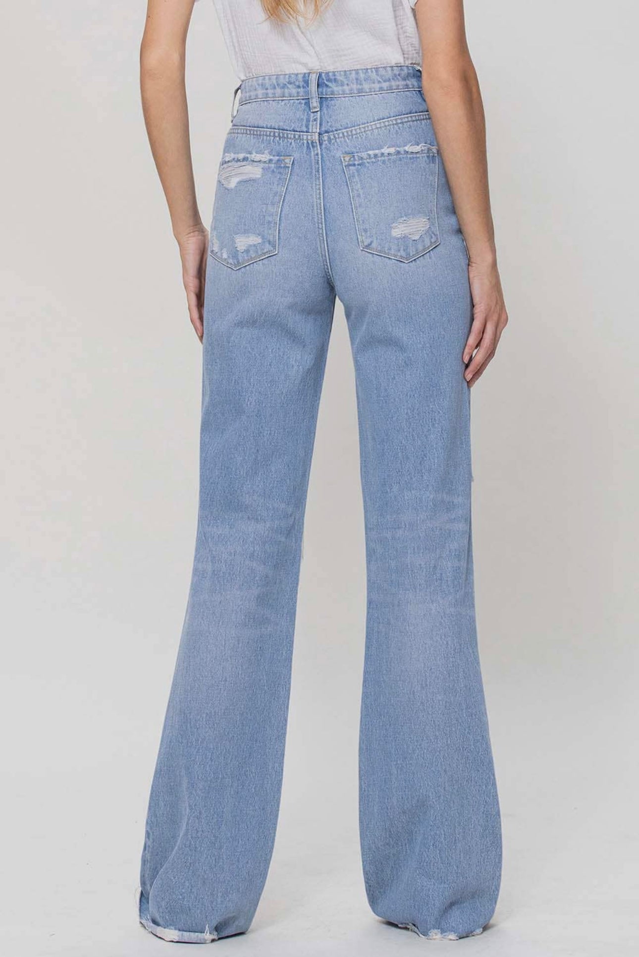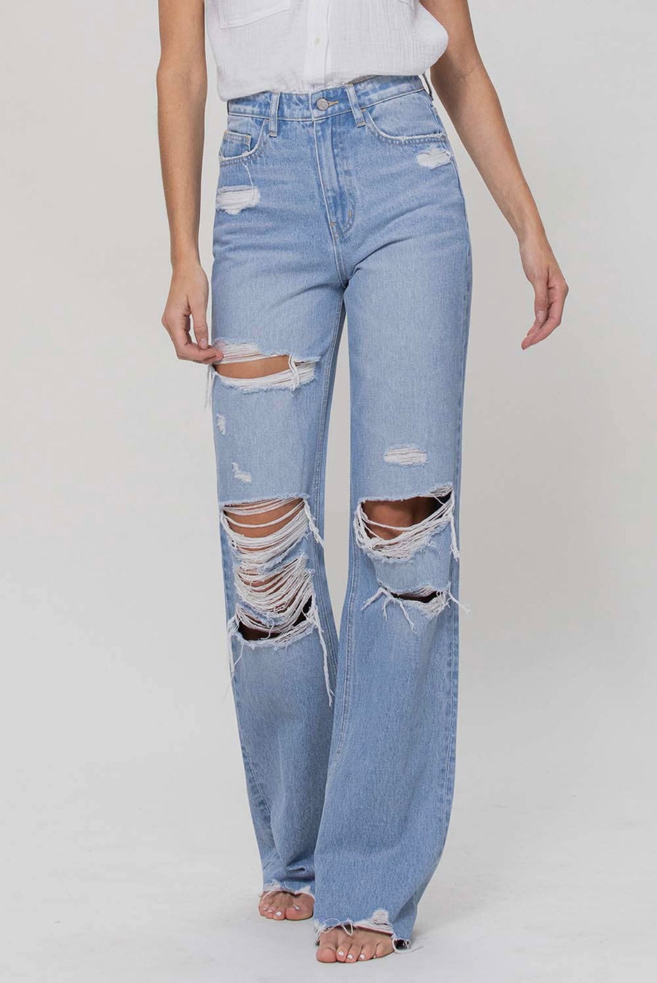 Hotter Than That's 90s wide leg distressed jeans are designed to perfectly flatter your shape. Crafted from extra long fabric, the jeans feature a high waisted fit and a wide leg design for an effortless cool look. With a vintage distressed finish, they will add an edge to any outfit.