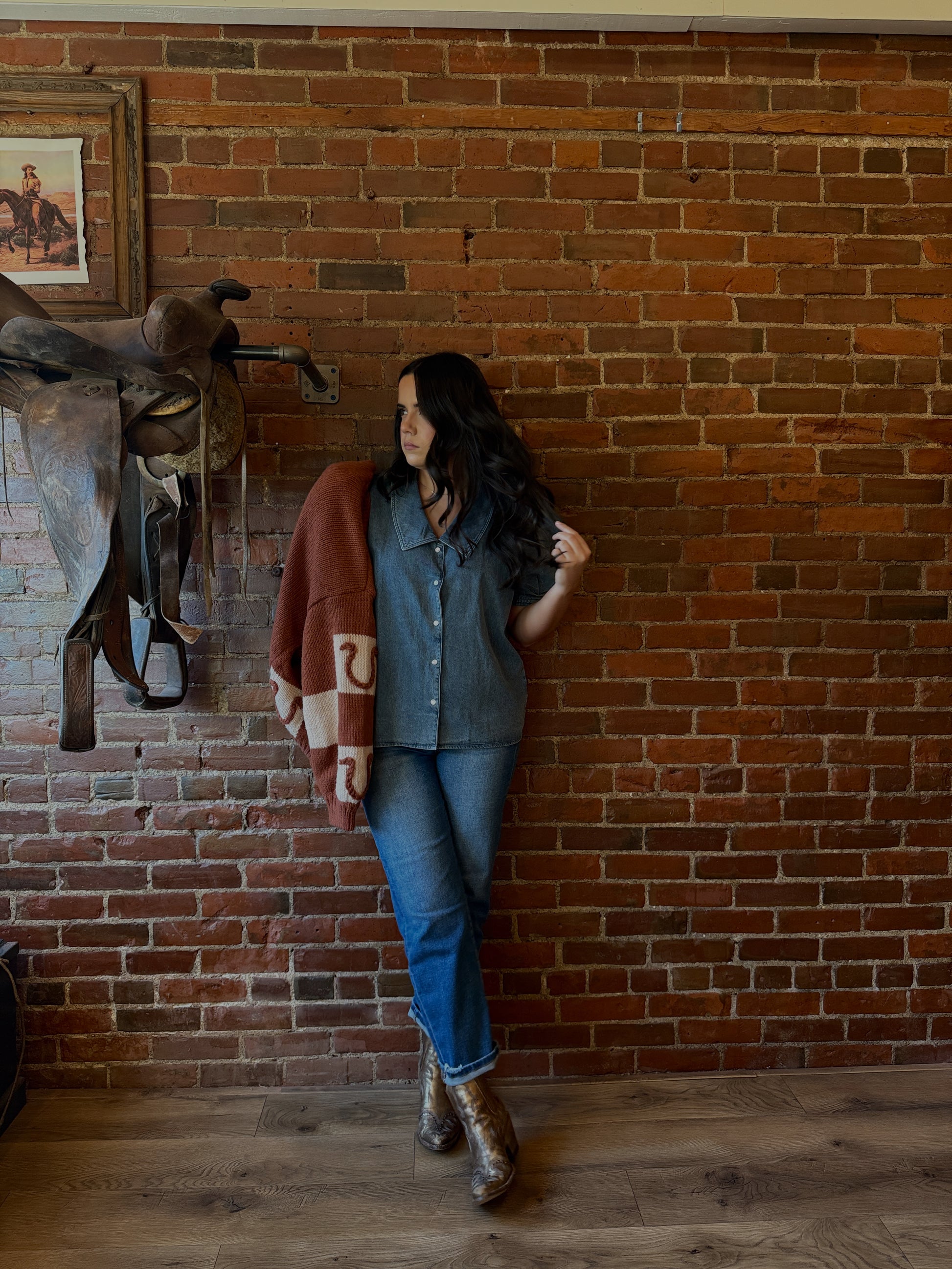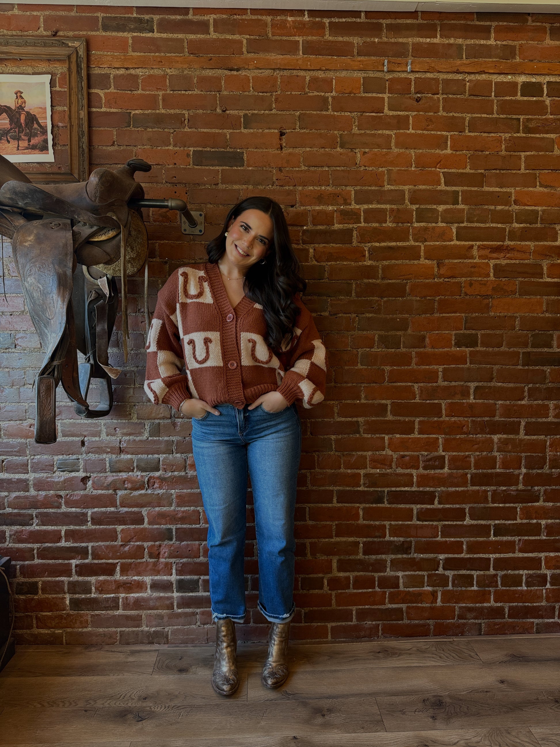 The Jaenie Checkered Horseshoe Cardigan is a stylish and versatile addition to your wardrobe. Made with a knit checkered pattern, its delicate braided horseshoe detail adds a touch of uniqueness. Stay warm and fashionable in this must-have cardigan.