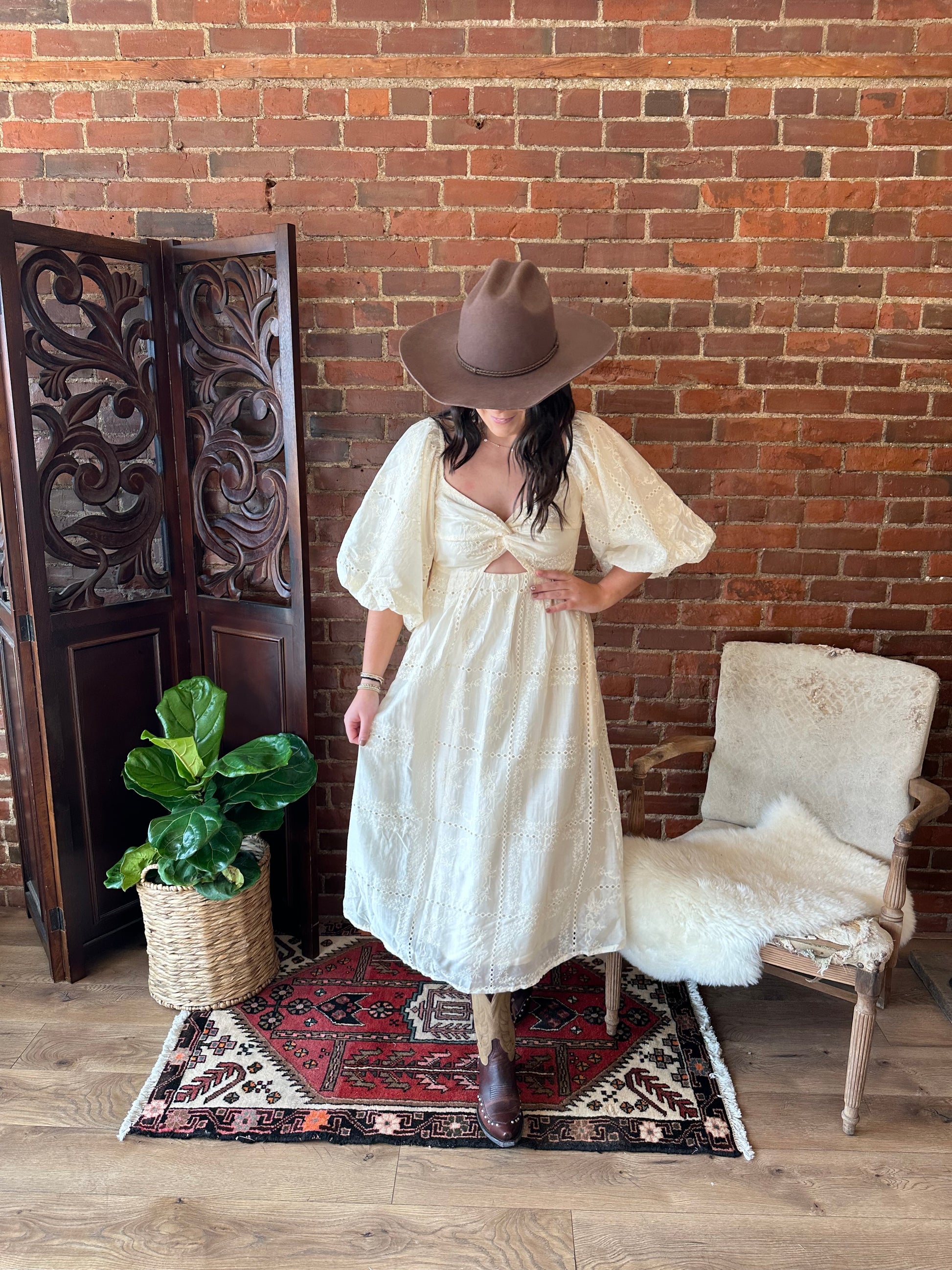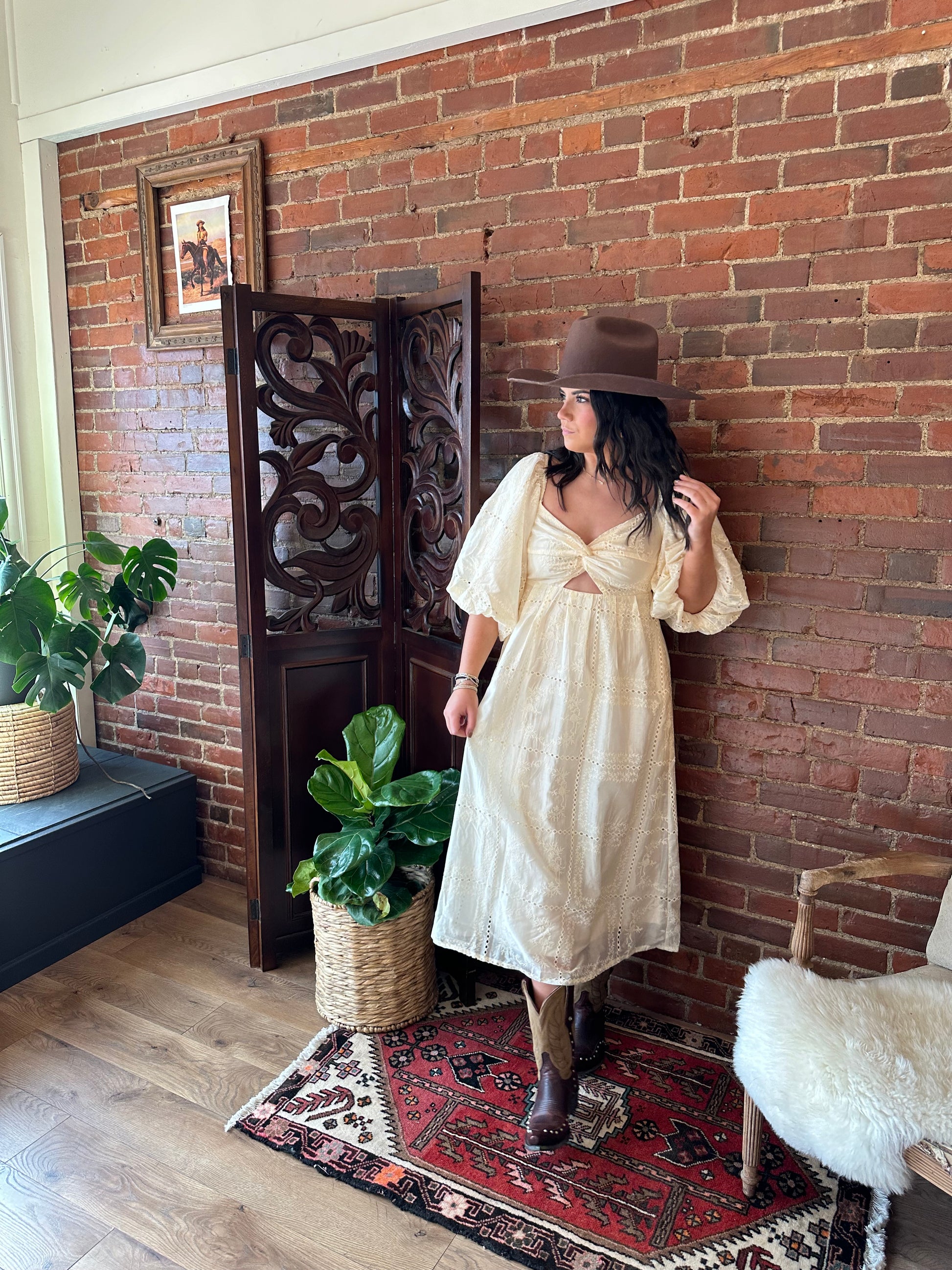 This Kye Embroidered Midi Dress combines beautiful eyelet details with a flattering sweetheart neckline and elegant midi length. The puff sleeves and keyhole add a touch of femininity, while the lining ensures a comfortable and polished fit. Perfect for any occasion, this dress is a must-have for any fashion-forward wardrobe.