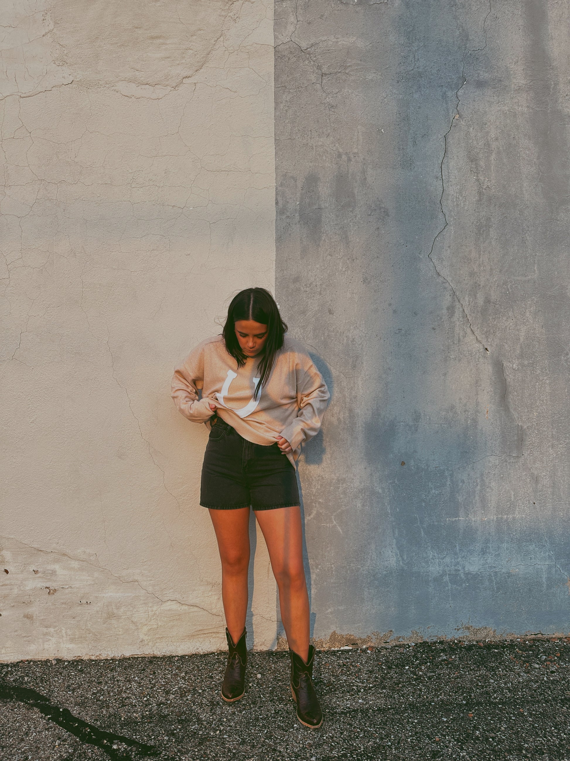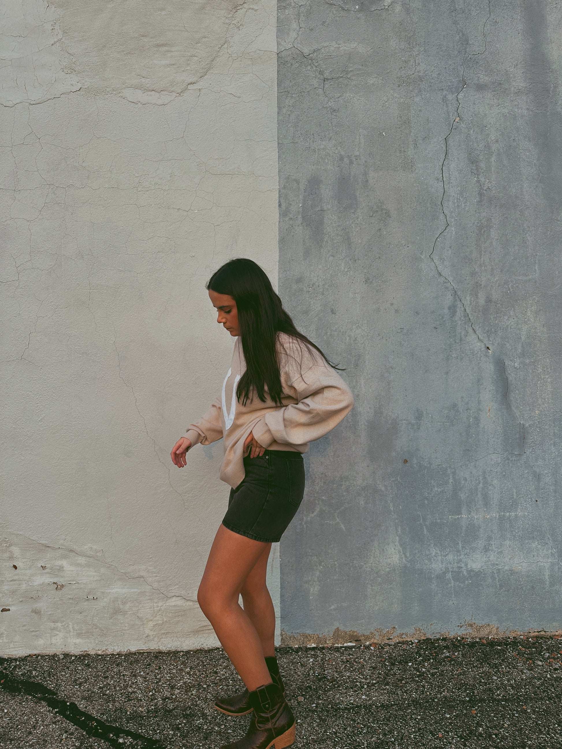 Bridget is wearing a size S and recommends sizing up if between sizes