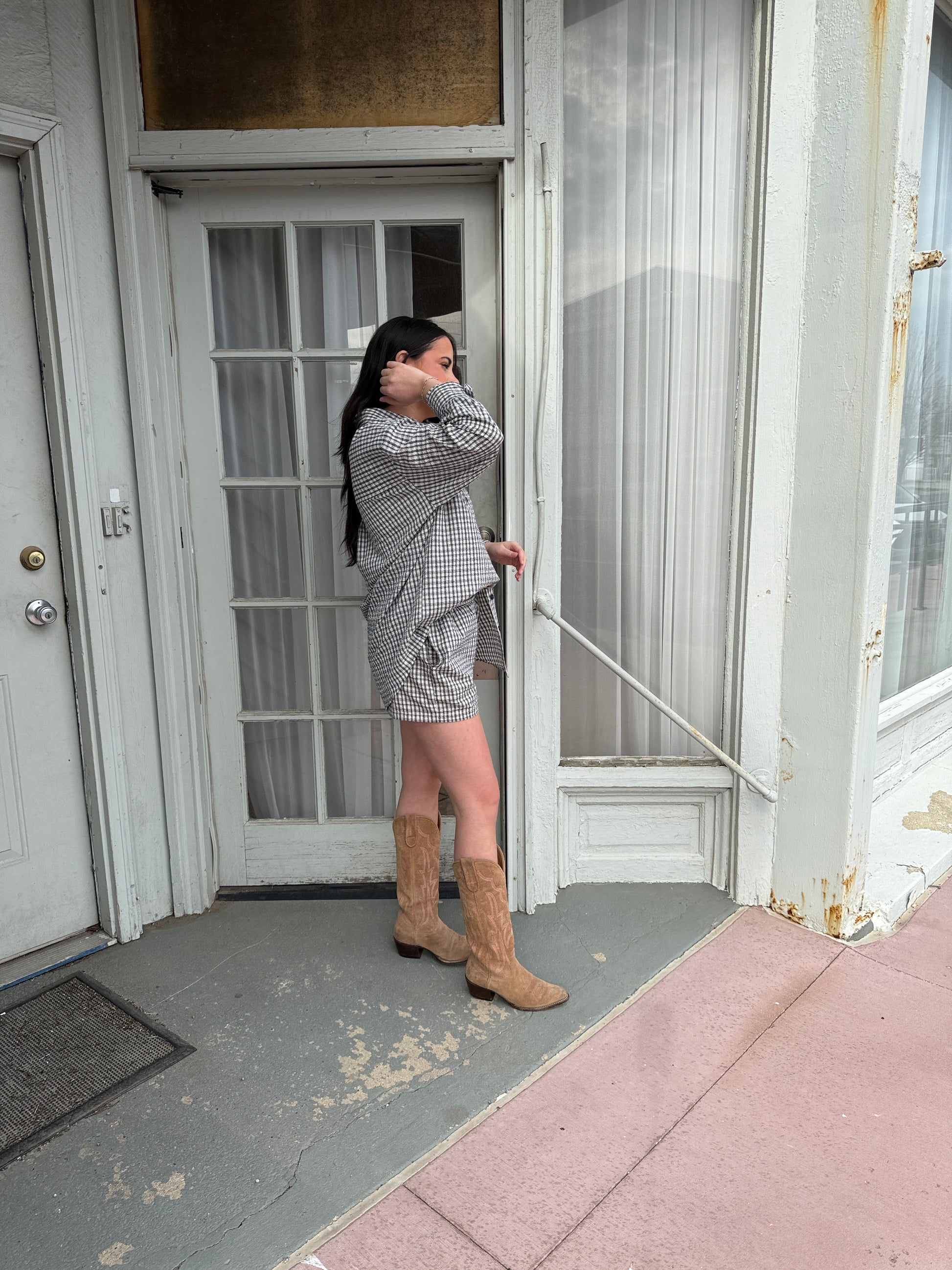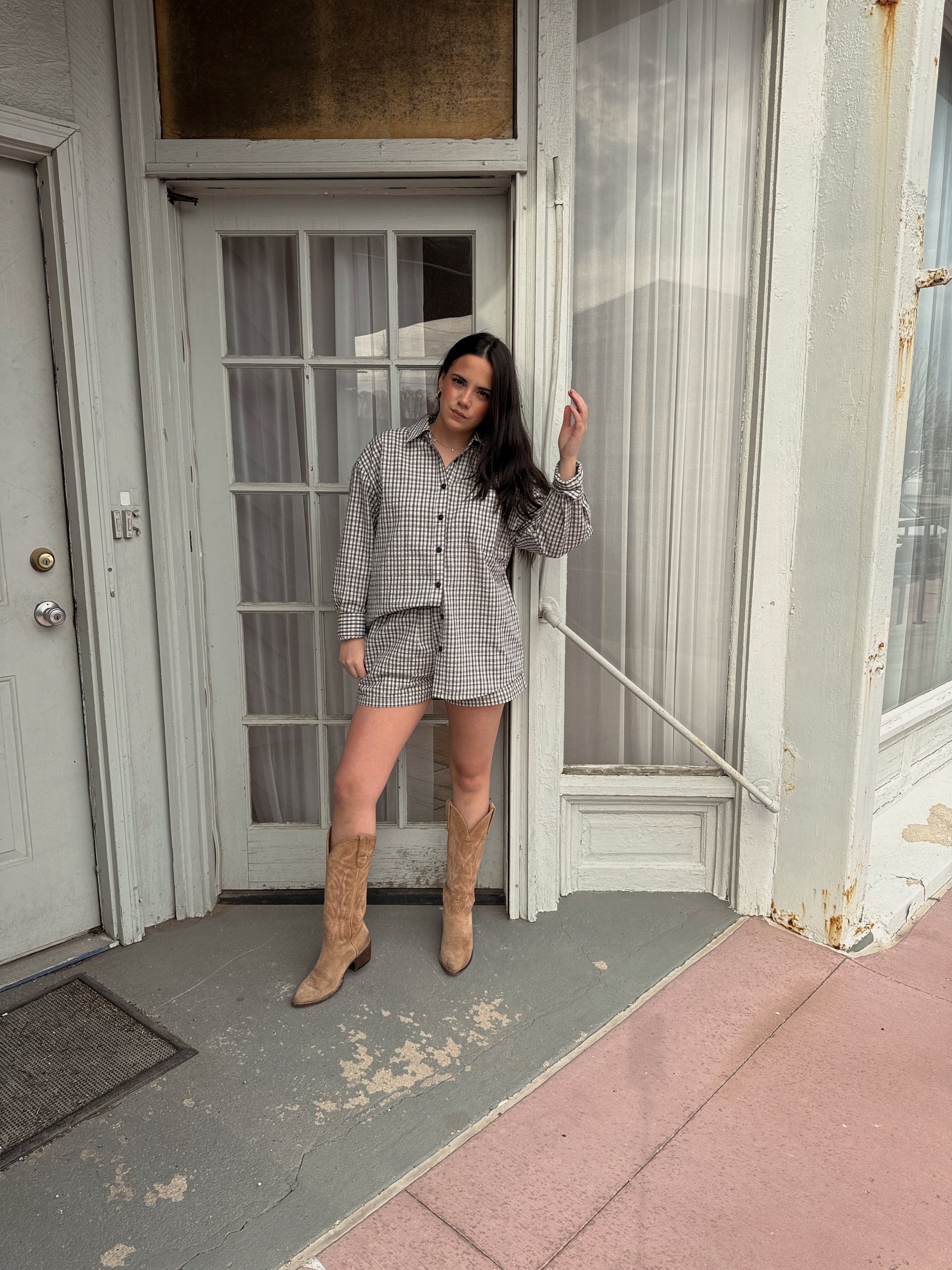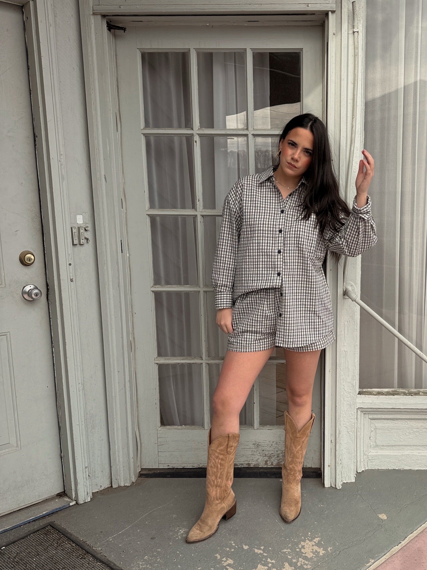 The Millie Wide Leg Shorts are crafted from gingham seersucker fabric, ensuring breathability and comfort. The elastic waist provides a secure and flexible fit, while the inclusion of pockets enhances functionality. This design promotes ease of movement, making them suitable for various casual settings.