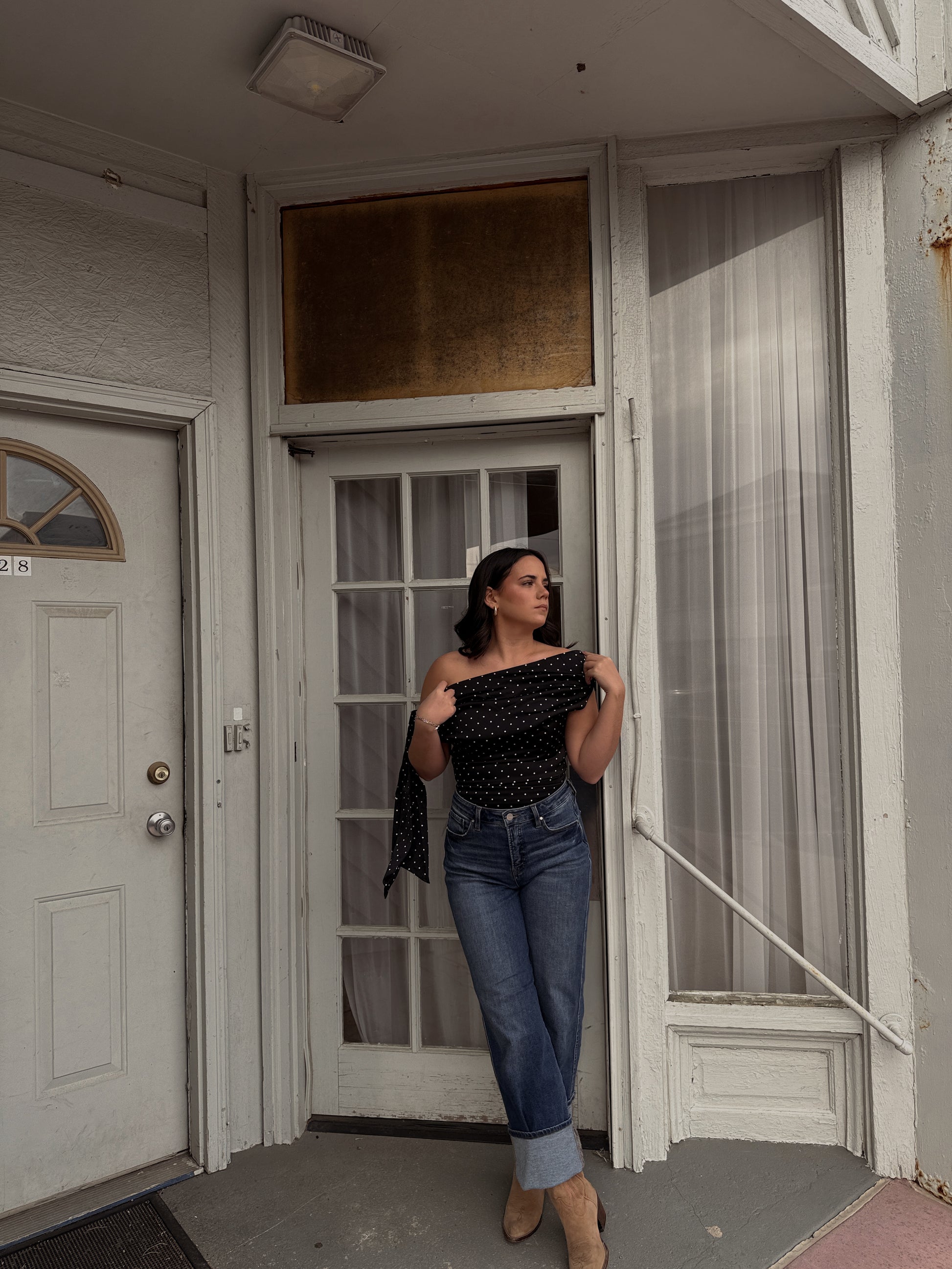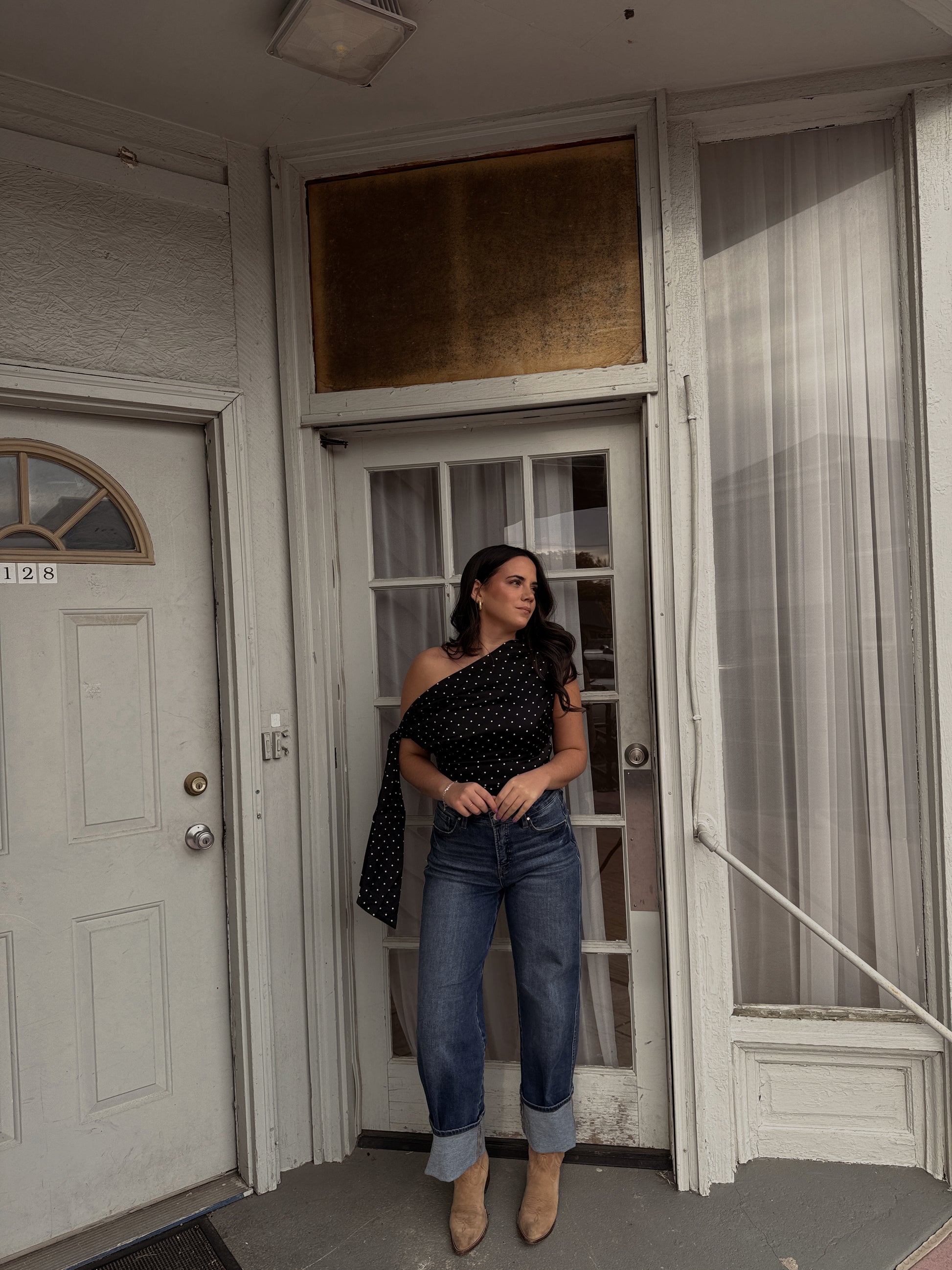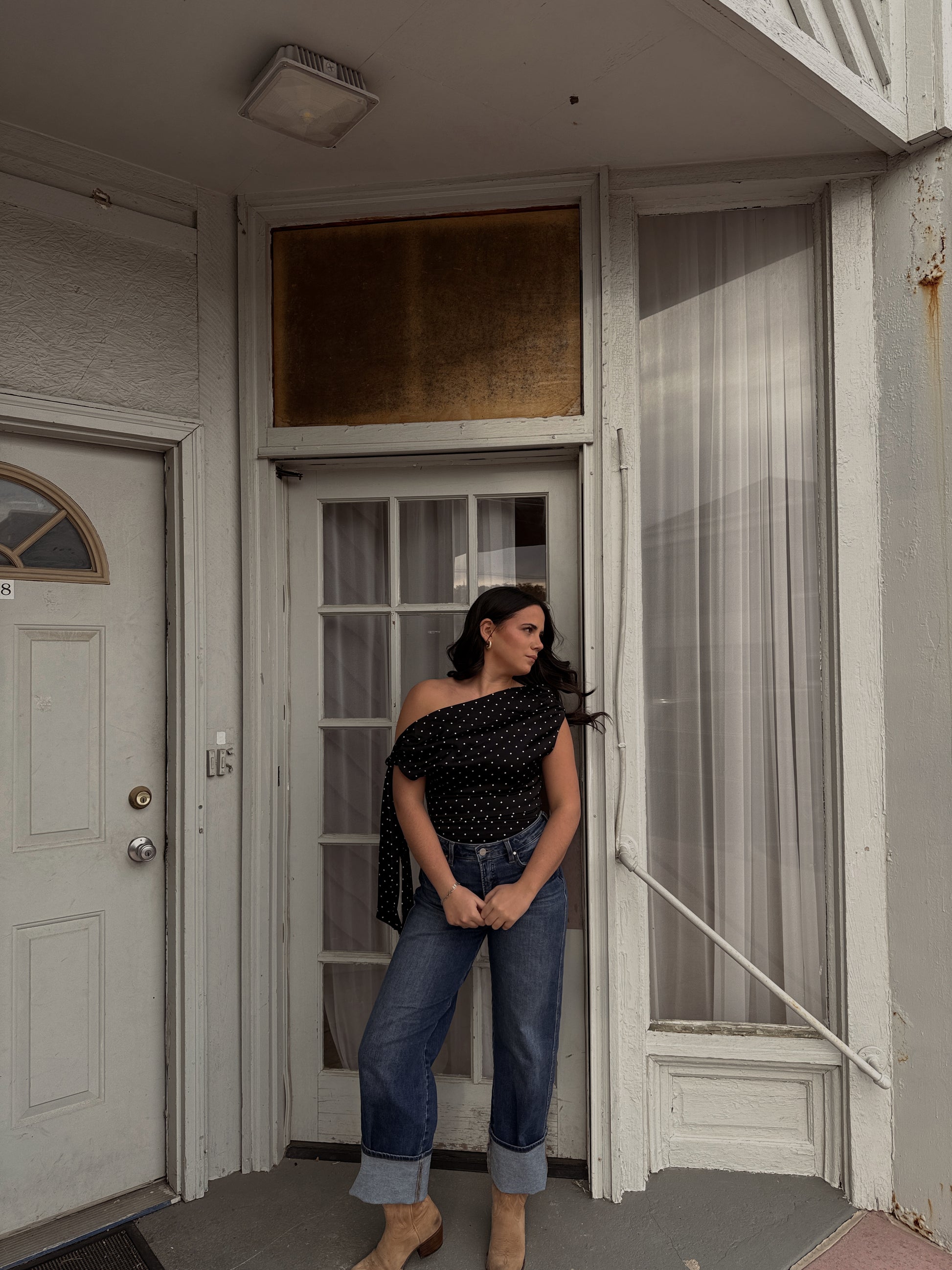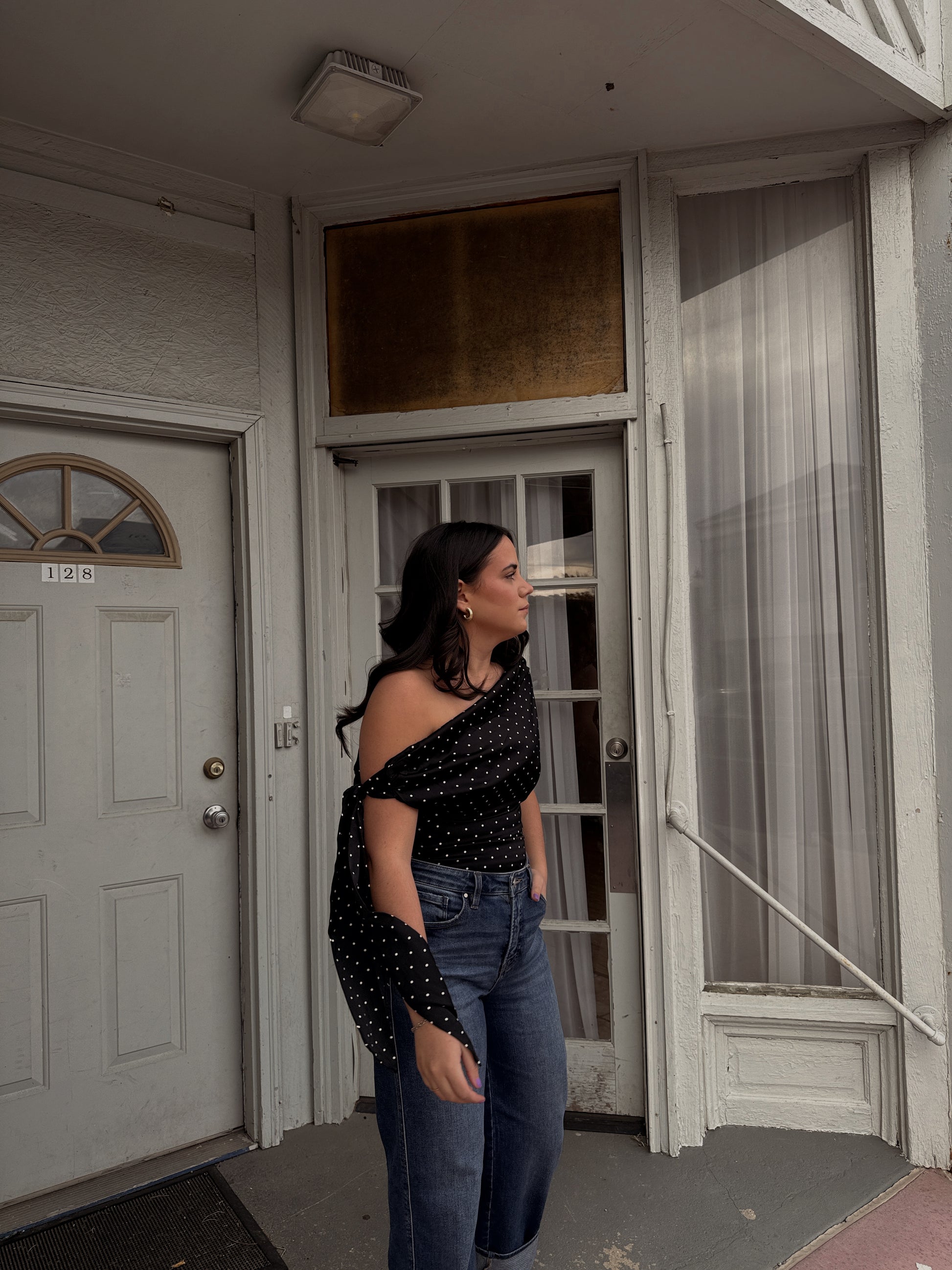 Expertly crafted for ultimate elegance, our Starry Night Blouse features a chic one shoulder design and luxurious silky black fabric. Adorned with delicate white polka dots for a touch of charm, this blouse is finished with a convenient side zipper for easy wear. Elevate your wardrobe with this timeless piece.