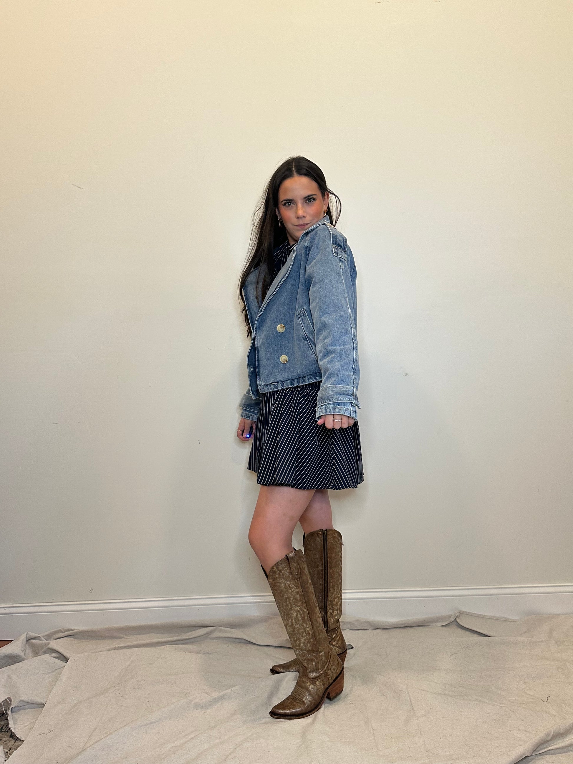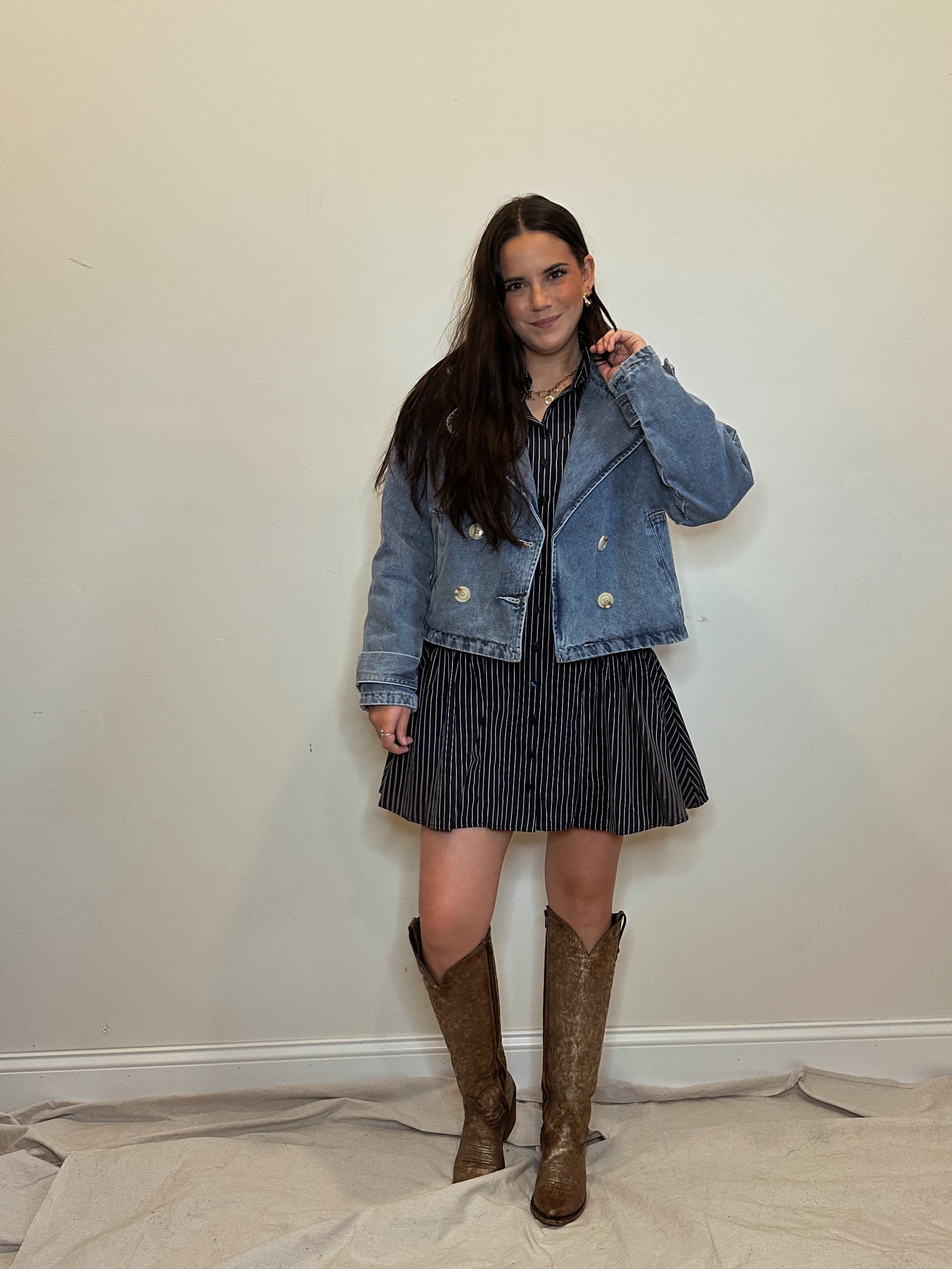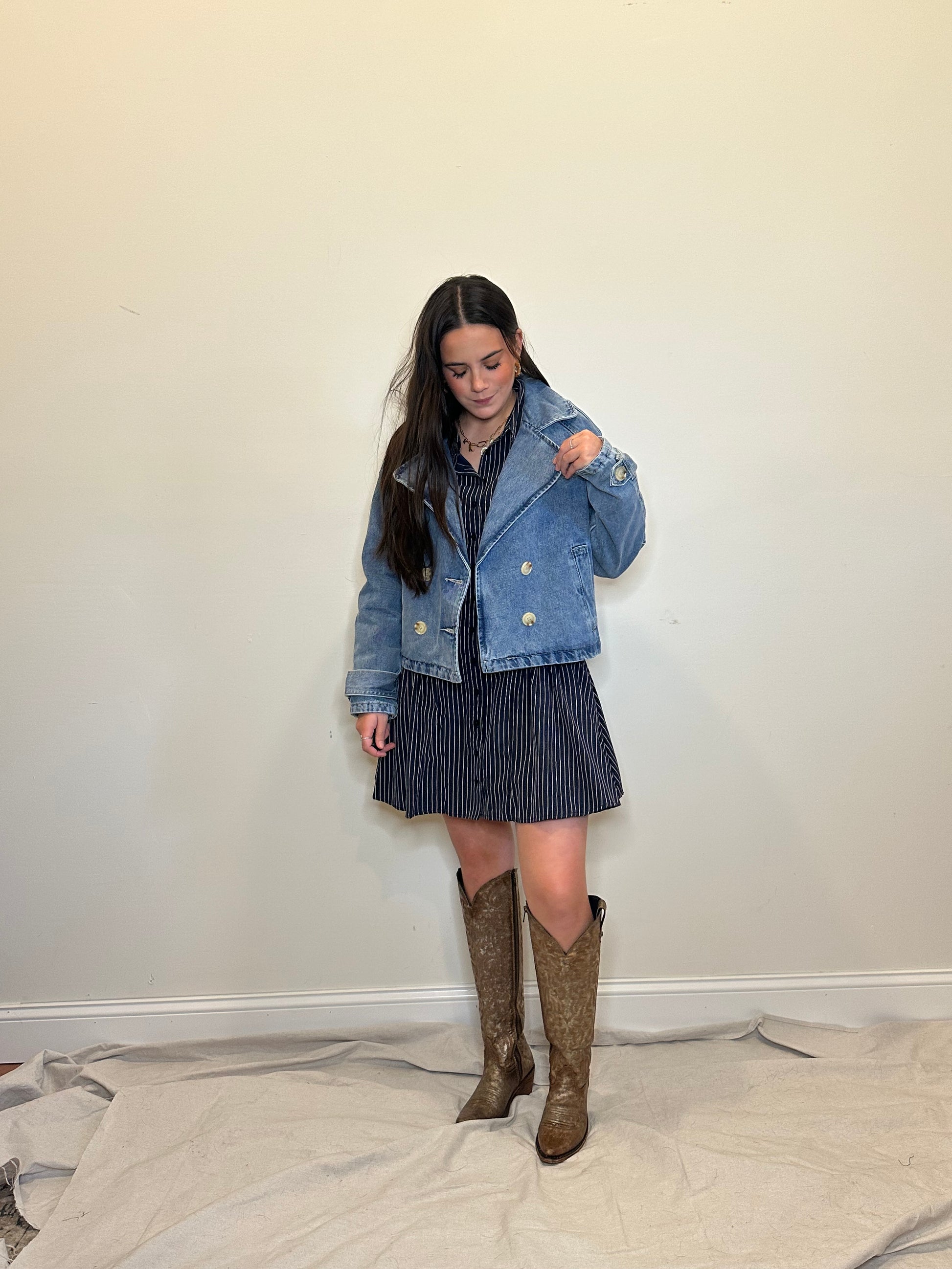 The Tatum Double Breasted Denim Blazer is a must-have for any fashion-forward individual. Made from high-quality denim, this blazer is both stylish and durable. Its double-breasted design and waist length cut give it a flattering fit, making it the perfect addition to any outfit. Upgrade your wardrobe with this versatile and timeless piece.