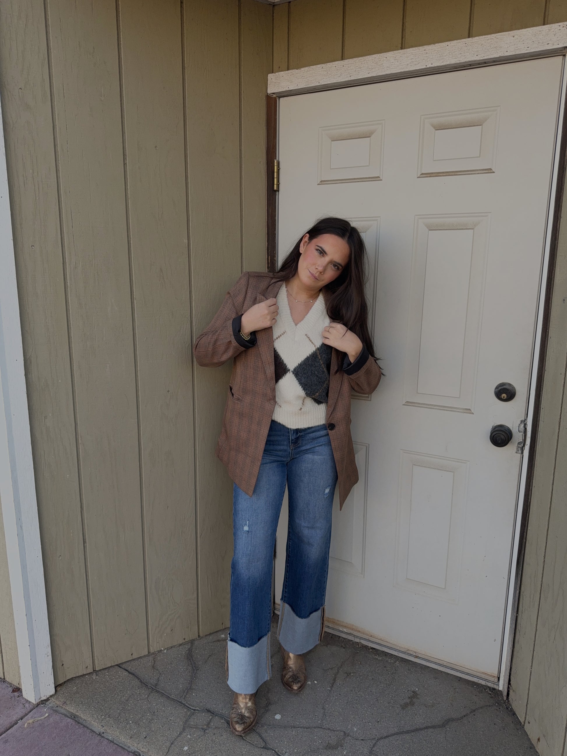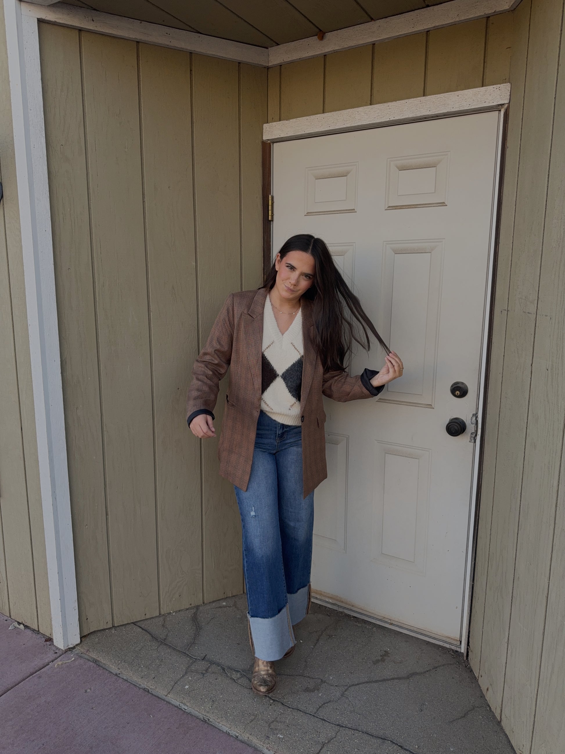 Introducing The Clayton Blazer - a stylish and versatile addition to any wardrobe. Expertly crafted, this thigh-length blazer features a brown plaid pattern, offering a touch of sophistication to any outfit. Elevate your look and exude confidence with this must-have piece.