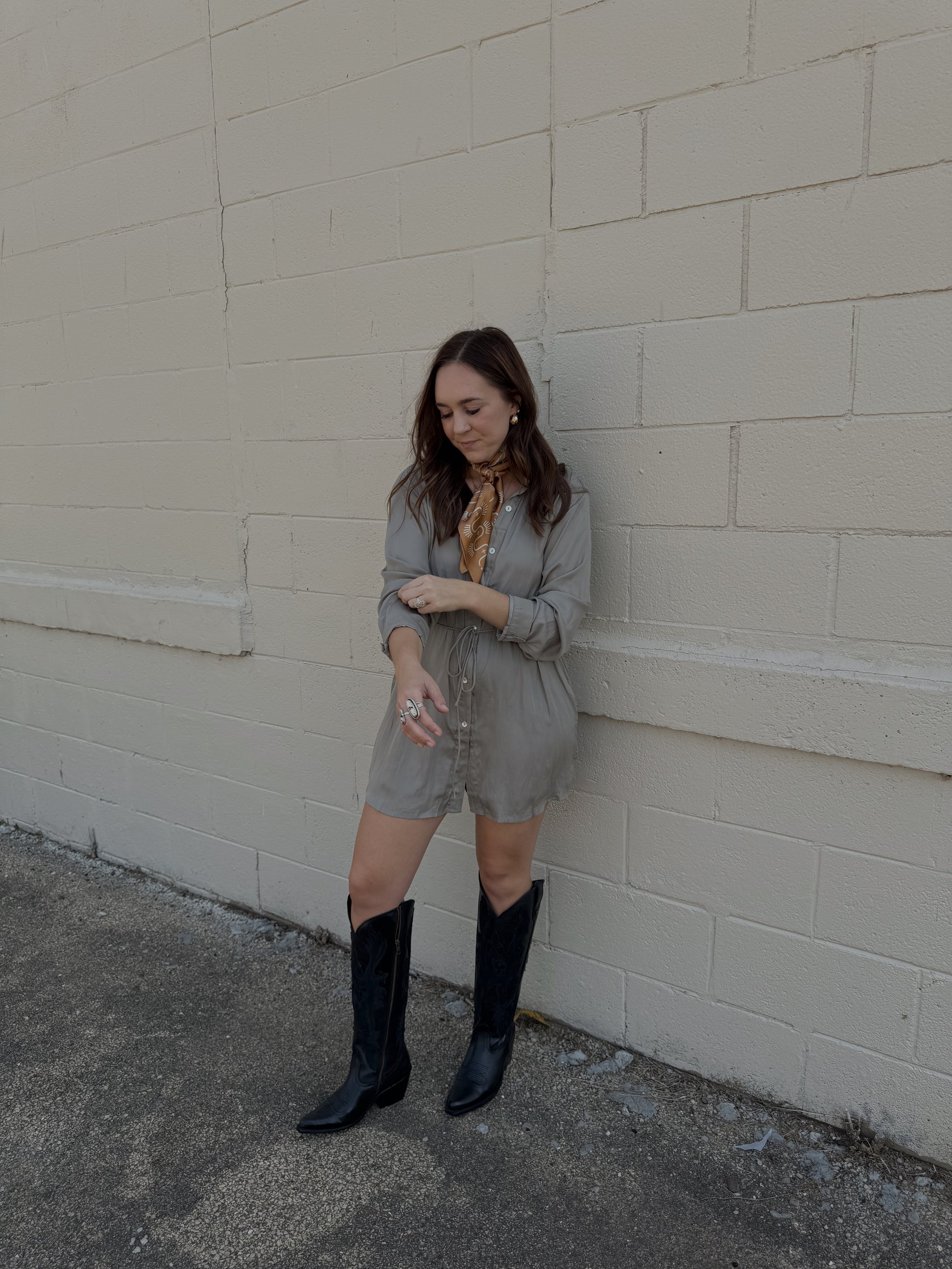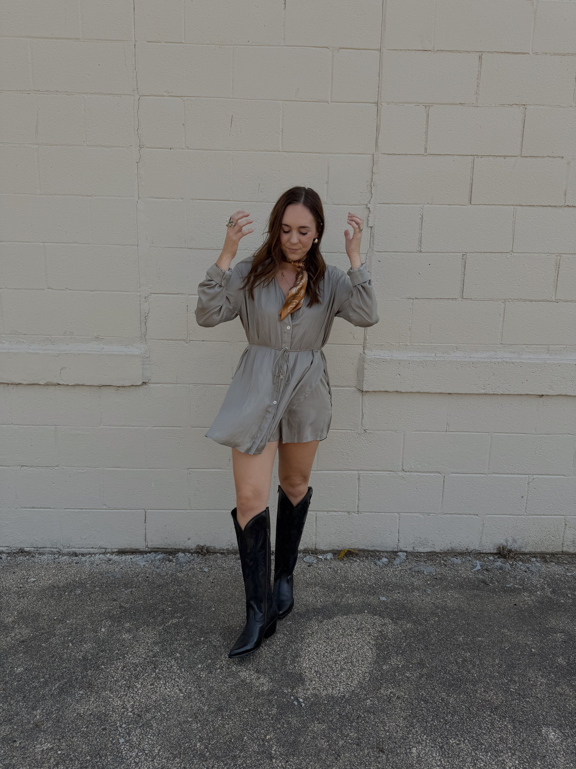 Experience effortless style with The Sloane Romper. This elegant satin romper features a unique layered design, with a dress shirt overlayer and shorts lining. The collared neckline, long sleeves with buttoned cuffs, and drop shoulder add a touch of sophistication. With a removable tie belt and side slits, this romper offers versatility and a relaxed fit for a flattering look. Perfect for any occasion with its thigh length and curved shirttail hem.