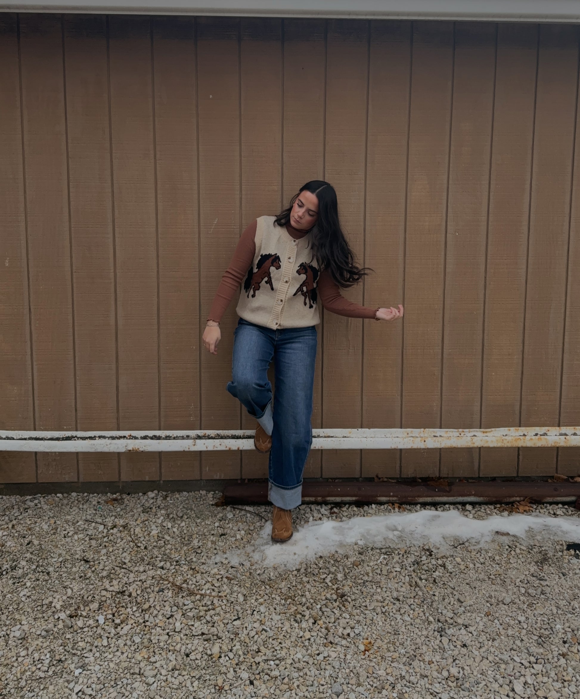 Introducing the Stable Knit Vest, a versatile addition to your wardrobe. Featuring a unique horse artwork button design, this knit vest is both stylish and functional. Stay warm and make a statement with this must-have piece.