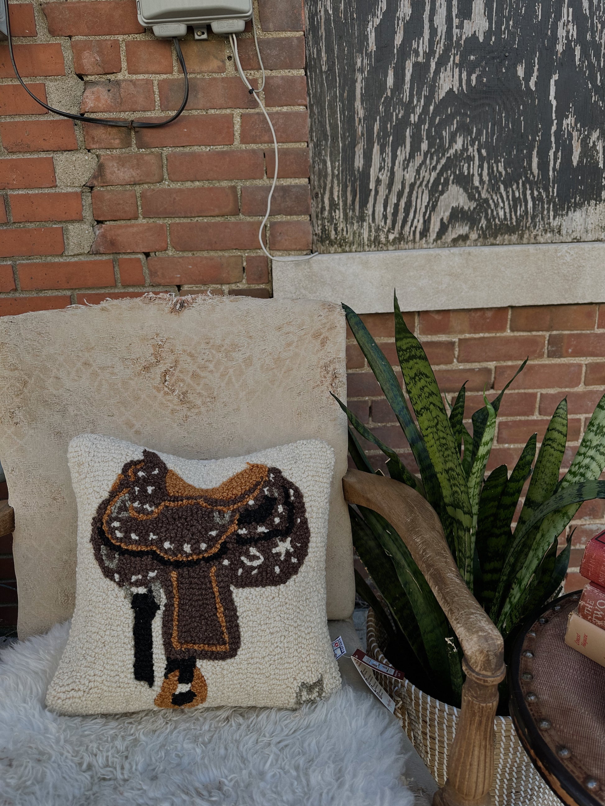 This SADDLE UP throw pillow is a beautifully handcrafted accent for any room. Measuring 14”x14”, it is made with 100% natural wool and features a zippered velveteen backing for easy cleaning. With its unique hand hooked design, this pillow is sure to add charm and warmth to any space.