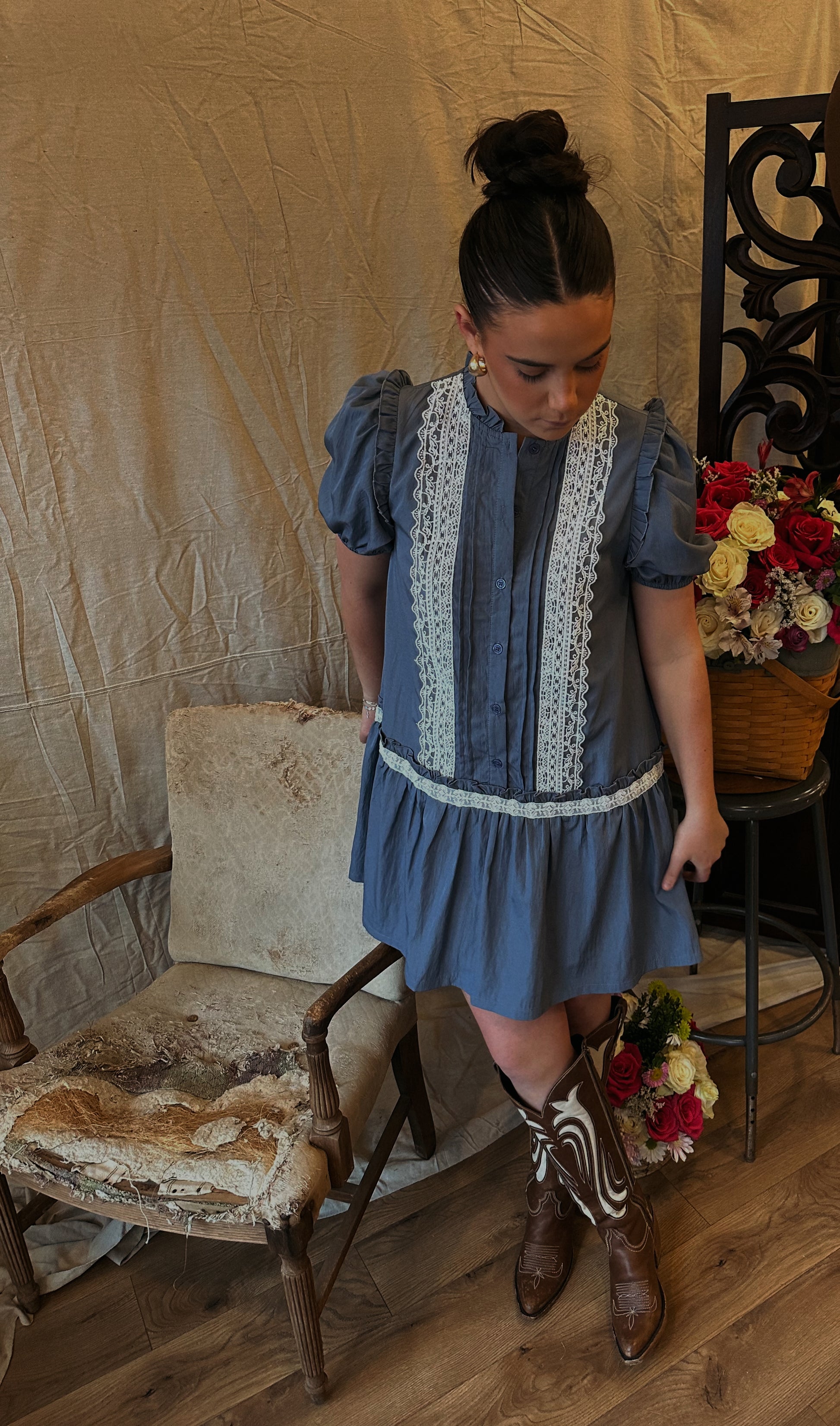 The Evelyn Button Up Dress features a drop hem and puff sleeves for a stylish silhouette. The dress is fully lined and has delicate lace details, making it both elegant and comfortable to wear. Perfect for any occasion.