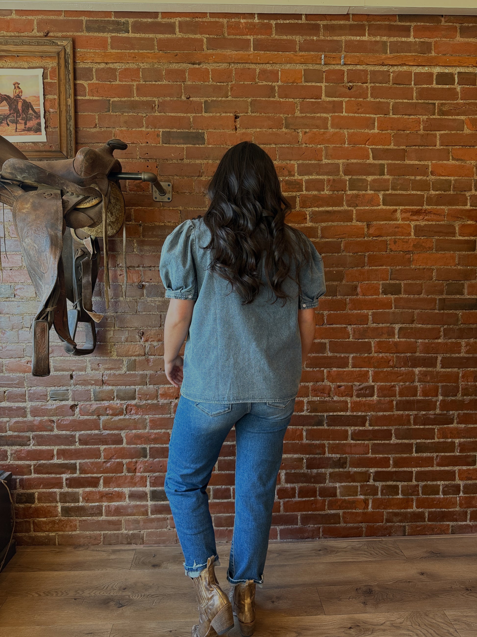 The Danny Denim Blouse combines classic style with trendy details, featuring puff sleeves, a pearl snap closure, and a Peter Pan collar. Made from high-quality denim fabric, this blouse adds a touch of sophistication to any outfit. Upgrade your wardrobe with this versatile and stylish piece.